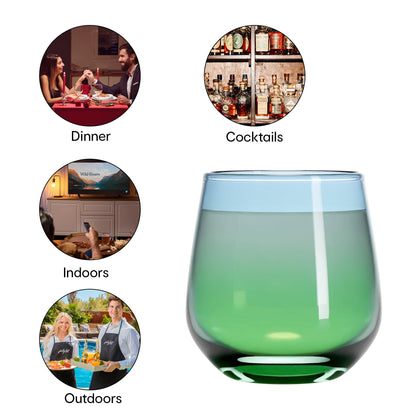 Introducing the Anko Dual Tone Blue and Green Stemless Glasses - Set of 6, a blend of elegance and versatility. Each glass has a capacity of 430ml, crafted from high-quality lead-free soda glass, perfect for everything from wine and whiskey to juice and mocktails. The set features an eye-catching dual-tone design that adds a unique touch to your dining experience.