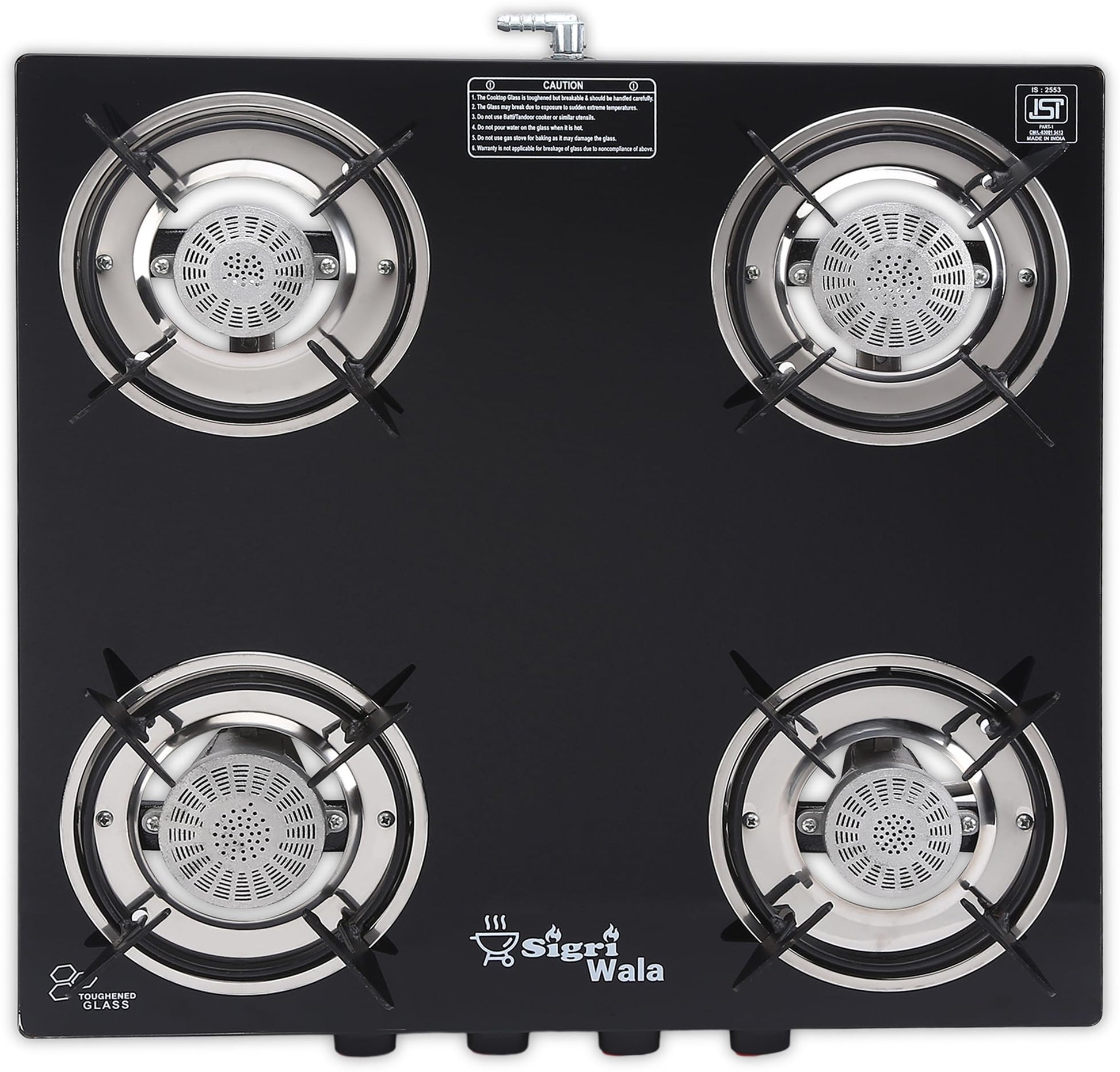 Discover the Sigri-wala 4 Burner Tornado Delux ISI Certified LPG Only Glass Manual Gas Stove
