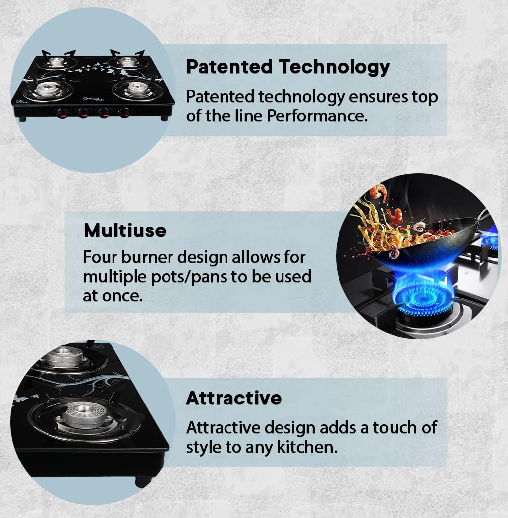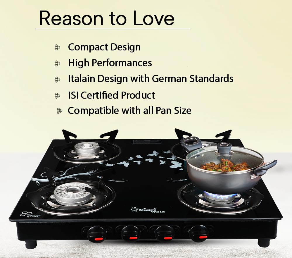 PREMIUM QUALITY: The Sigri-wala 4B Gas Stove is expertly crafted from high-grade stainless steel and glass, ensuring exceptional durability and longevity. This reliable kitchen companion comes complete with essential parts and accessories, making assembly and use a breeze.
