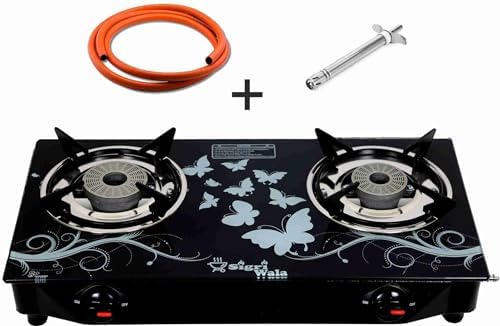 Introducing the Sigri-wala Lighter & Hose Pipe ISI Certified 2 Burner Design Combo Glass Manual Gas Stove