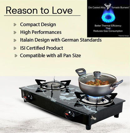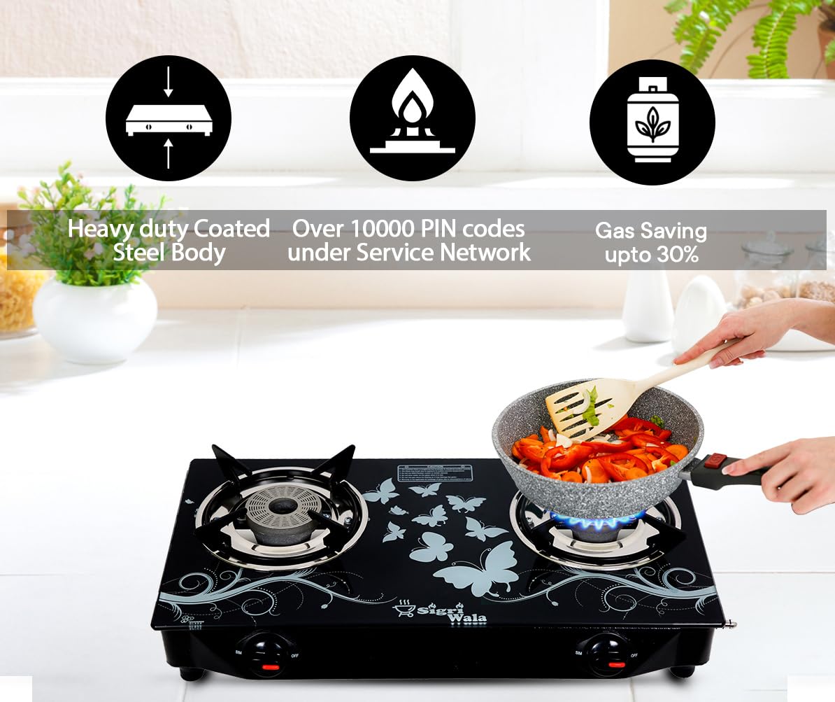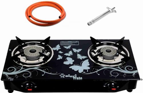 Elevate your cooking experience with the Sigri-wala Lighter & Hose Pipe ISI Certified 2 Burner Design Combo Glass Manual Gas Stove.