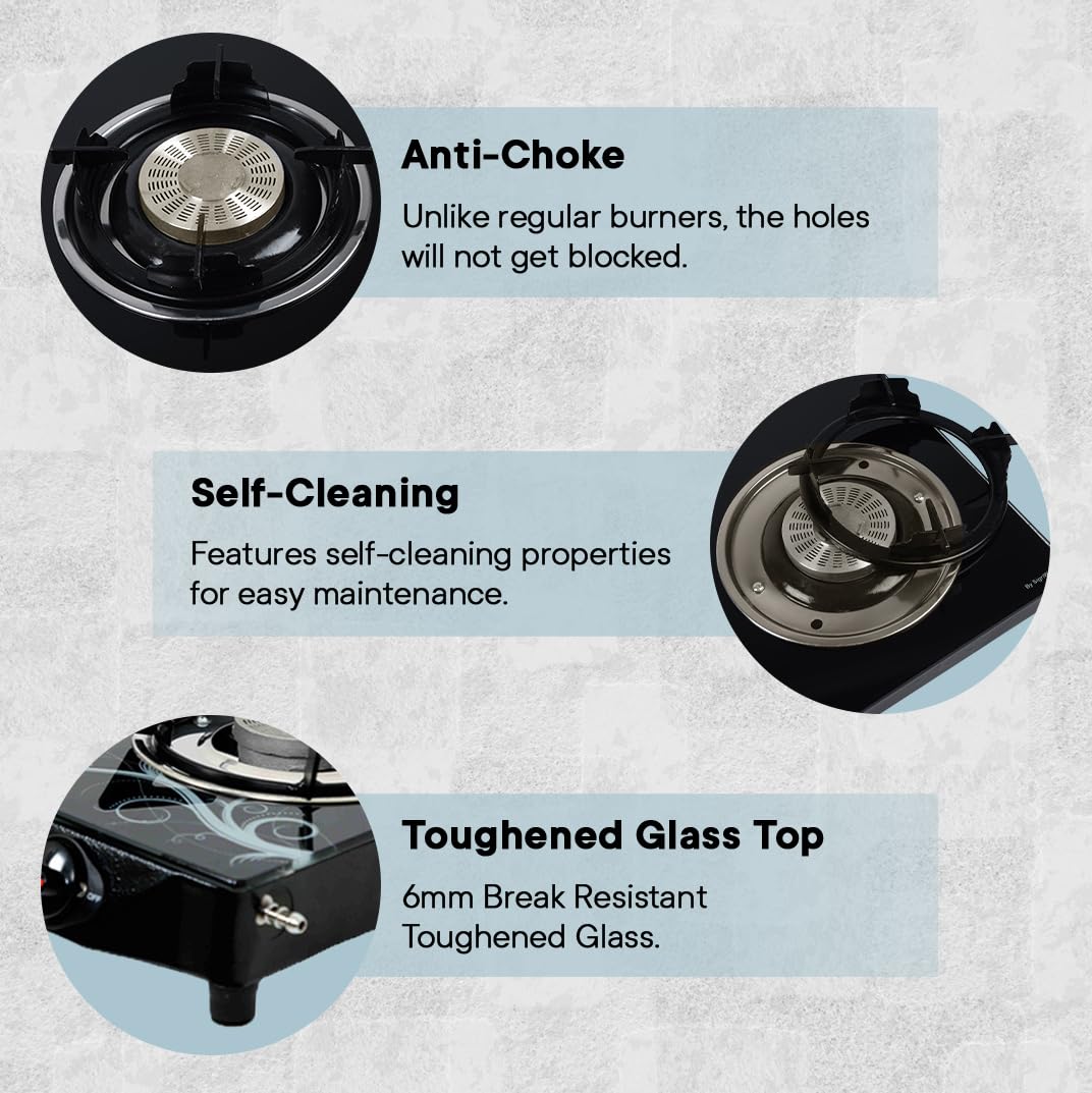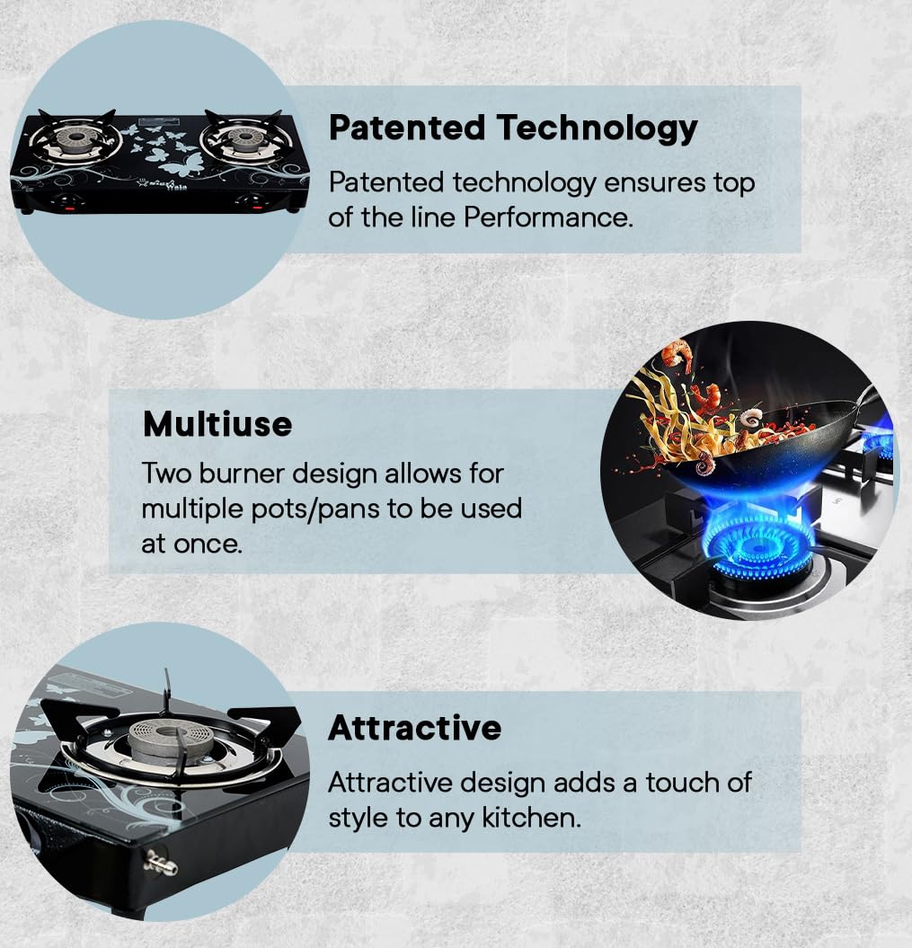 OPTIMIZED COOKING EXPERIENCE: Designed with the modern kitchen in mind, this gas stove offers quick and efficient cooking across its two burners. The manual ignition feature provides reliability, while the thoughtfully designed burner stands optimize fuel consumption, effectively saving you both time and money during meal preparations.