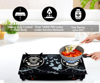 Sigri-wala Lighter & Hose Pipe ISI Certified 2 Burner Design Combo Glass Manual Gas Stove (2 Burners)