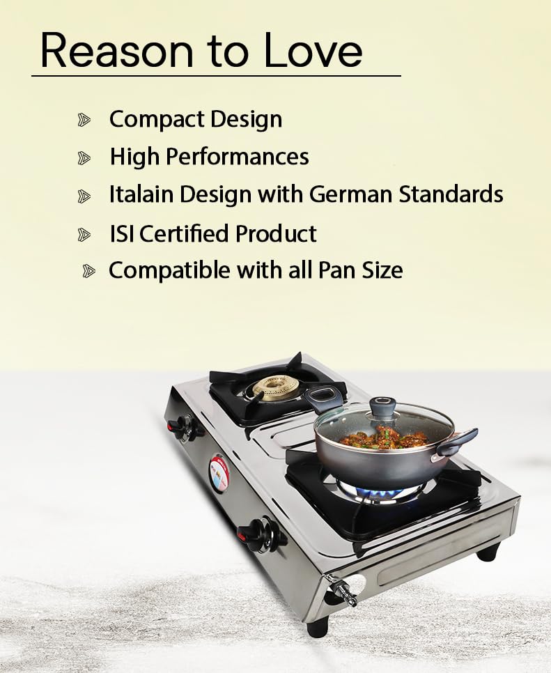 EFFICIENT COOKING: Engineered to cater to the demands of bustling kitchens, this gas stove features 2 burners for quick and efficient cooking. The included auto-ignition feature enhances convenience, while the gas saver burner stand optimizes fuel consumption, ultimately saving you time and money in the kitchen.