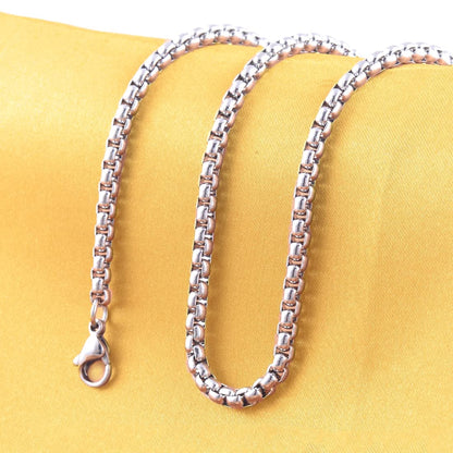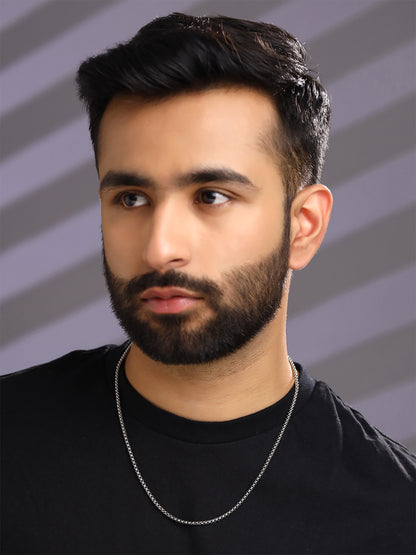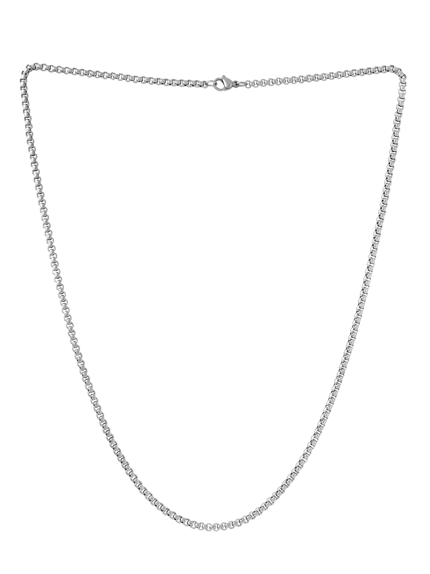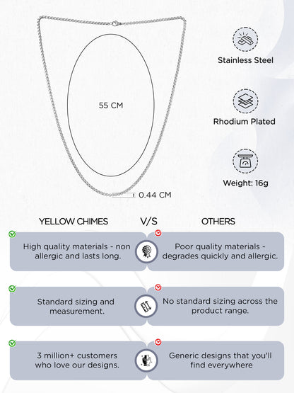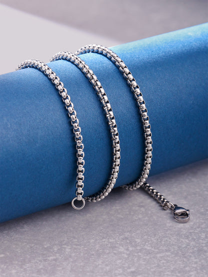Introducing the Silver Box Neck Chain for Men by Yellow Chimes, a stylish and durable addition to your jewelry collection. This premium chain is crafted from pure surgical stainless steel, ensuring it remains safe for your skin while maintaining its shine. With a length of 55 centimeters (22 inches) and a width of 4 mm, this elegant neck chain makes a perfect gift for both men and boys, whether it's a birthday, anniversary, or special occasion.