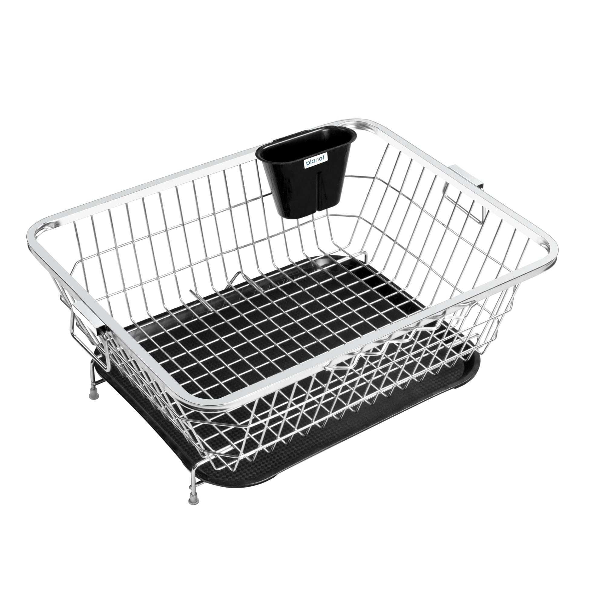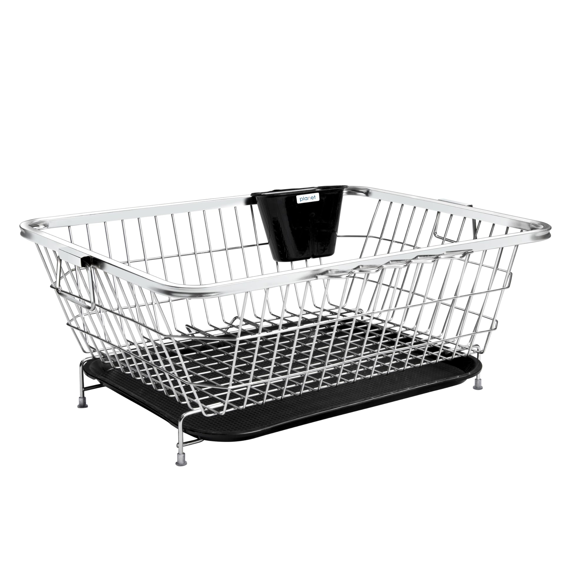 Introducing the Stainless Steel Dish Drainer Basket by Planet, designed for your kitchen to ensure a clutter-free environment. With dimensions of 56 x 43 x 22 cm, this dish drying rack is made from high-quality stainless steel with a sleek nickel-chrome mirror finish. It features a removable spoon and knife holder, along with an efficient water collection tray, making it the ultimate kitchen companion.