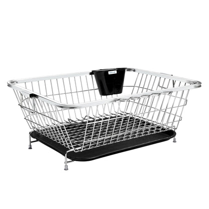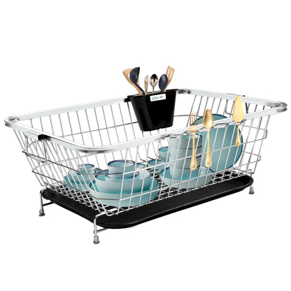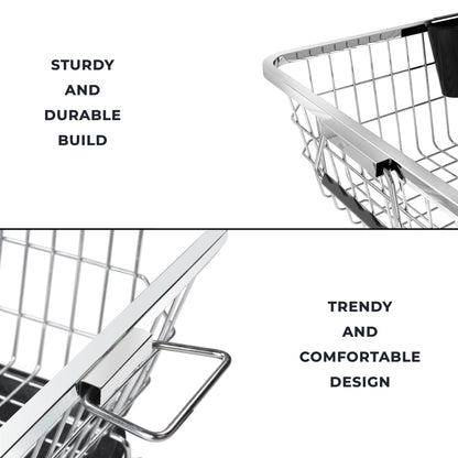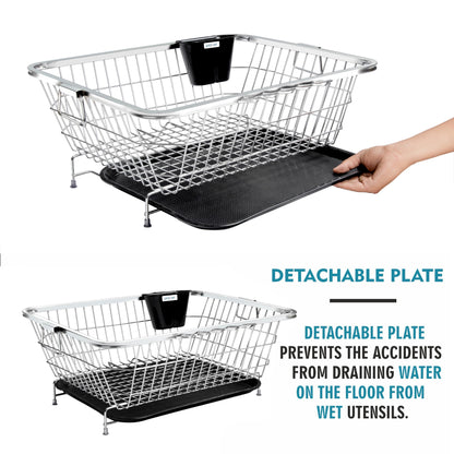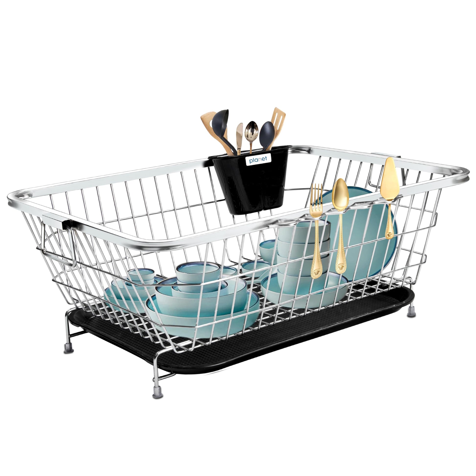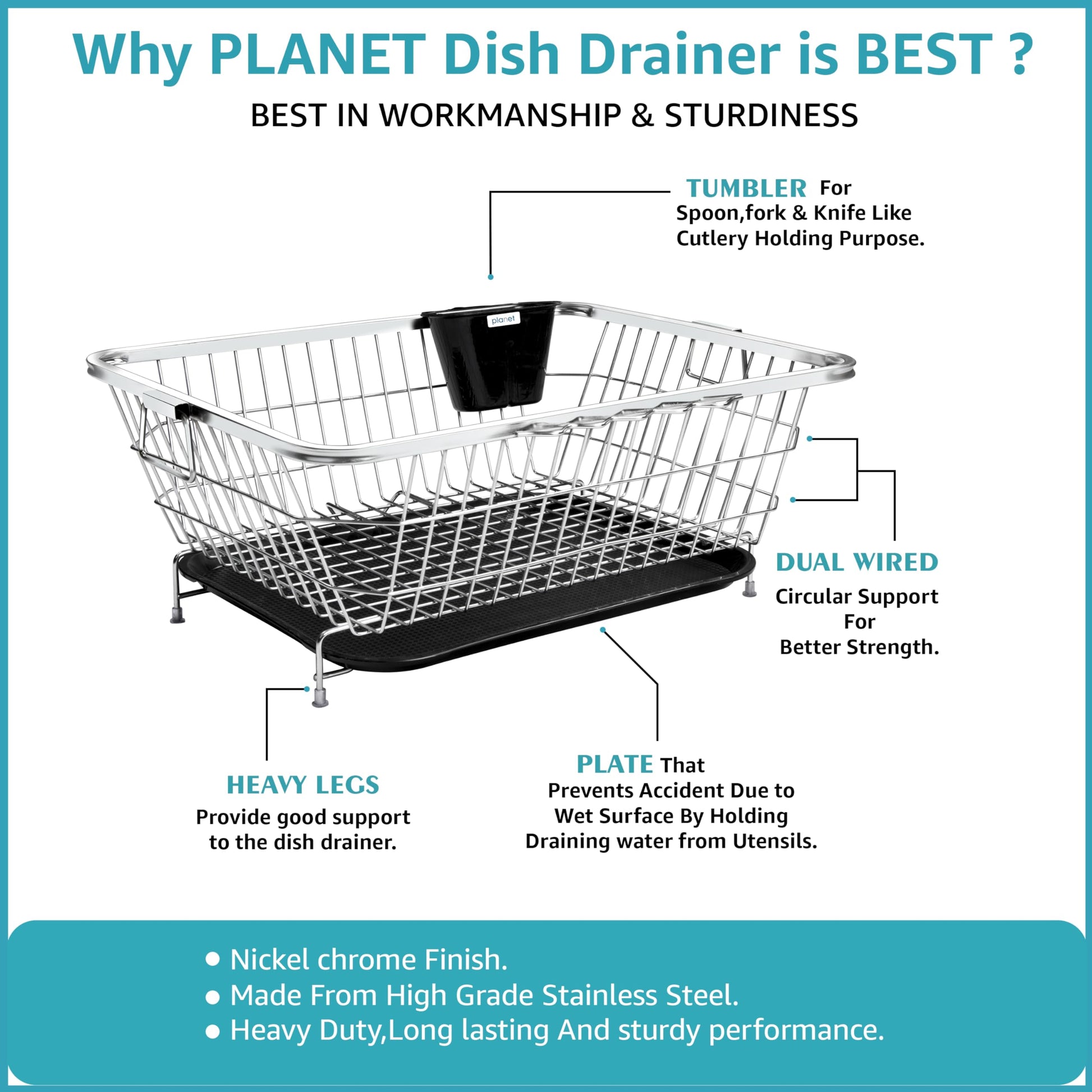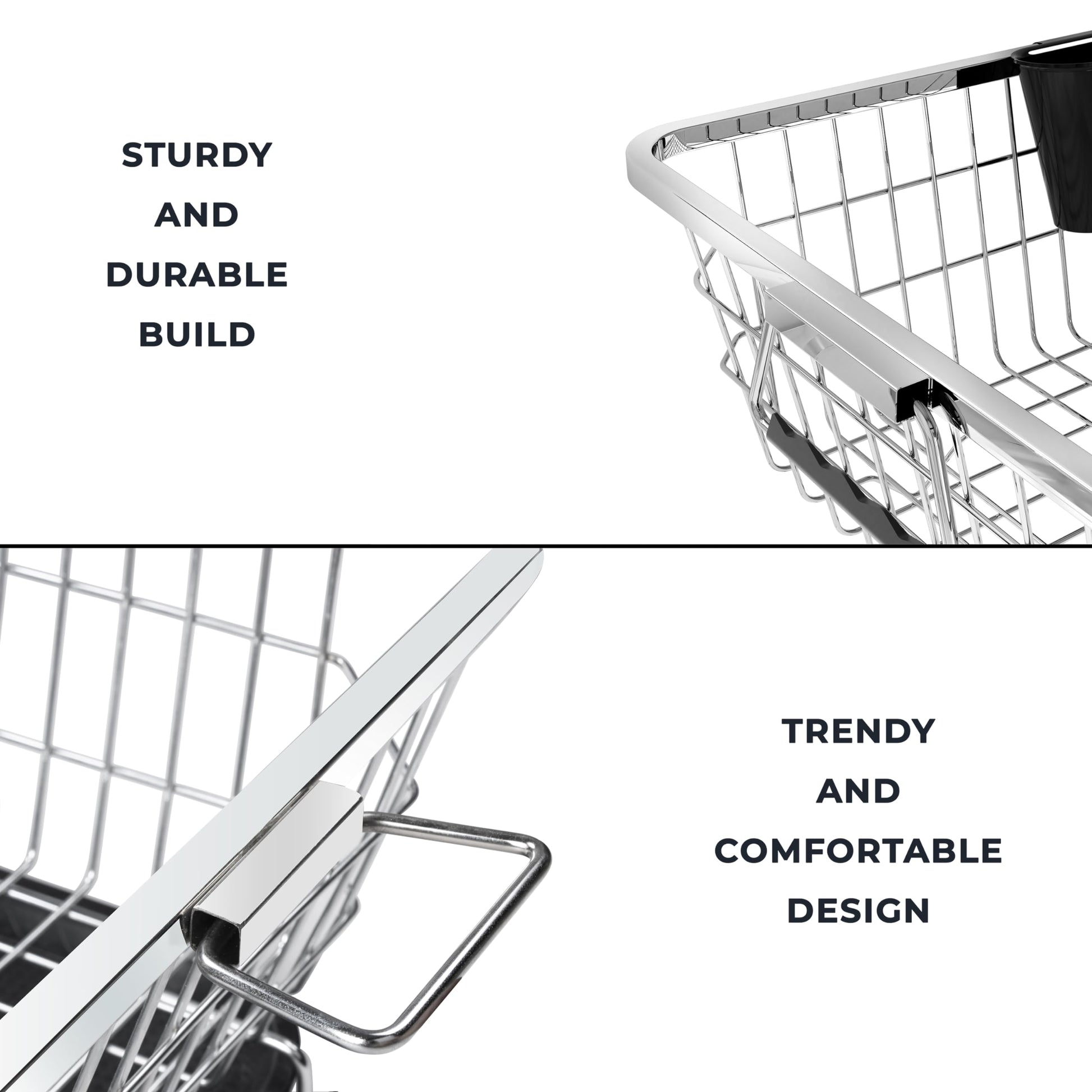 • DURABLE MATERIAL: Crafted from superior quality stainless steel, this dish drainer is rustproof and corrosion-free, thanks to the nickel-chrome coating. The rubber fittings in its legs prevent scratches on your countertops.