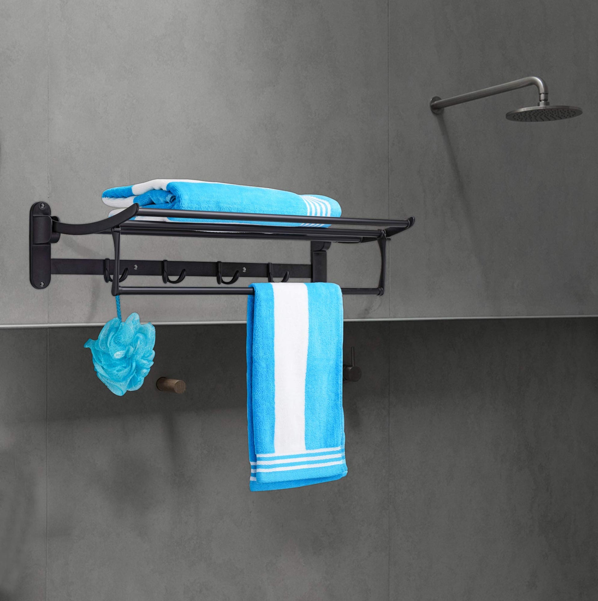 Plantex Stailness Steel Folding Towel Rack for Bathroom/Towel Rod with Hooks/Towel Stand/Towel Holder/Bathroom Accessories (24 inch) Matt Black