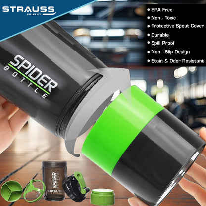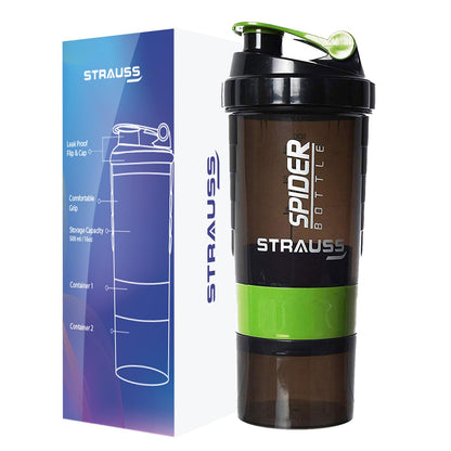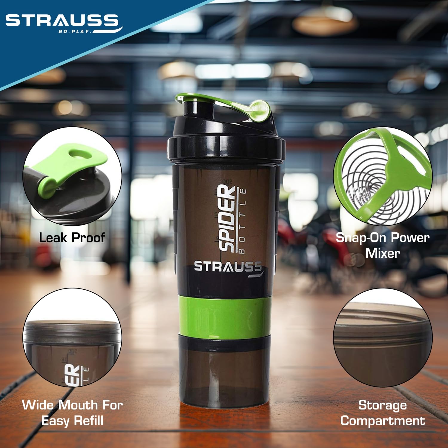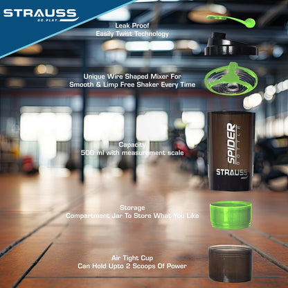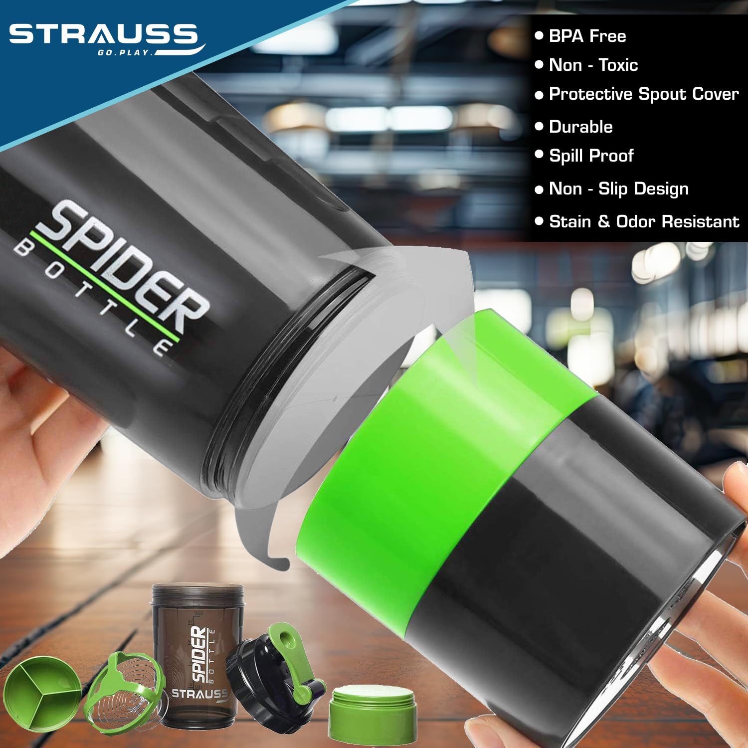 STRAUSS Spider Gym Shaker Bottle | Shakers for Protein Shake with 2 Storage Compartment | Leakproof Gym Protein Shaker for Post and Pre-Workout Drink | 100% BPA Free (500 ML, Pack of 1,Green)