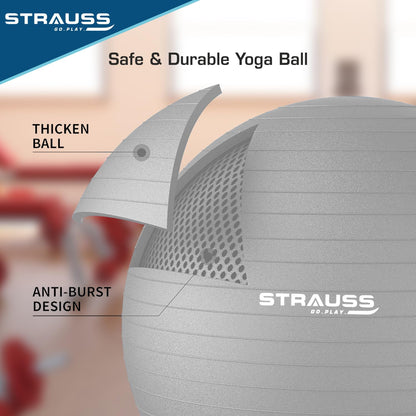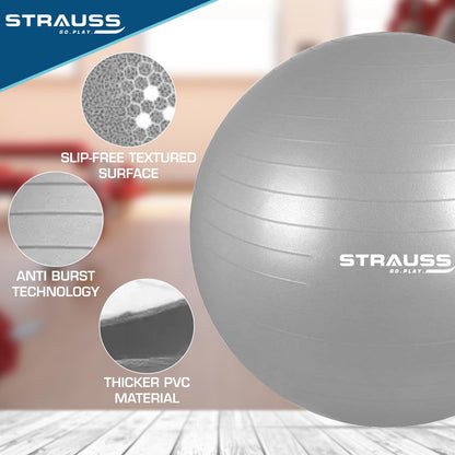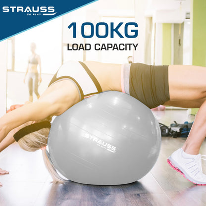 STRAUSS Anti-Burst Rubber Gym Ball with Free Foot Pump | Round Shape Swiss Ball for Exercise, Workout, Yoga, Pregnancy, Birthing, Balance & Stability, 75 cm, (Grey)