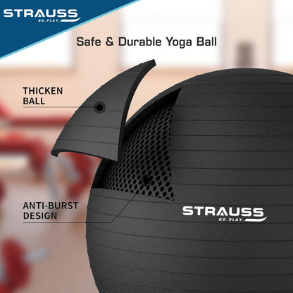 STRAUSS Anti-Burst Rubber Gym Ball with Free Foot Pump | Round Shape Swiss Ball for Exercise, Workout, Yoga, Pregnancy, Birthing, Balance & Stability, 65 cm, (Black)