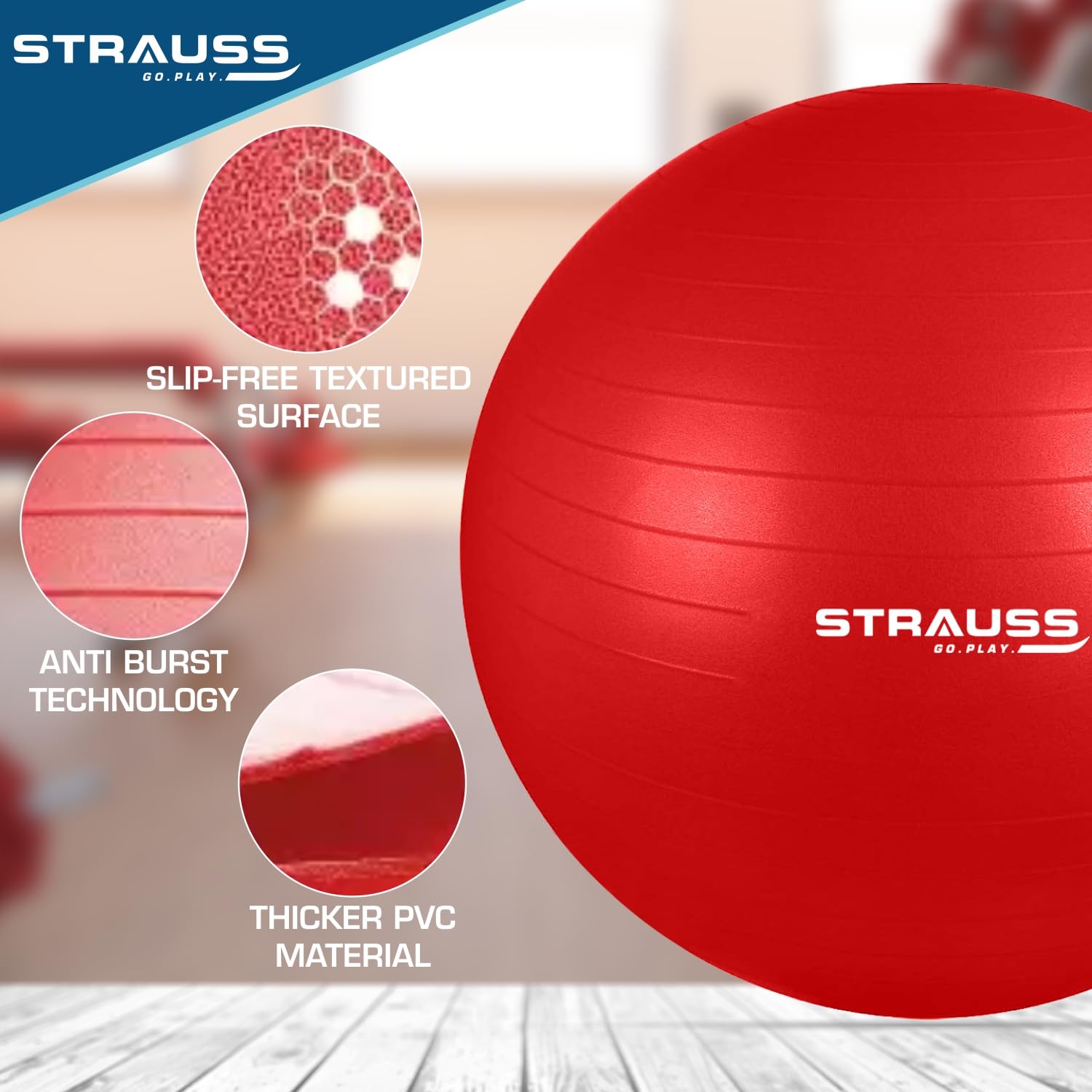 STRAUSS Anti-Burst Rubber Gym Ball with Free Foot Pump | Round Shape Swiss Ball for Exercise, Workout, Yoga, Pregnancy, Birthing, Balance & Stability, 65 cm, (Red)