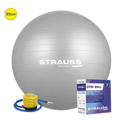 STRAUSS Anti-Burst Rubber Gym Ball with Free Foot Pump | Round Shape Swiss Ball for Exercise, Workout, Yoga, Pregnancy, Birthing, Balance & Stability, 55 cm, (Grey)