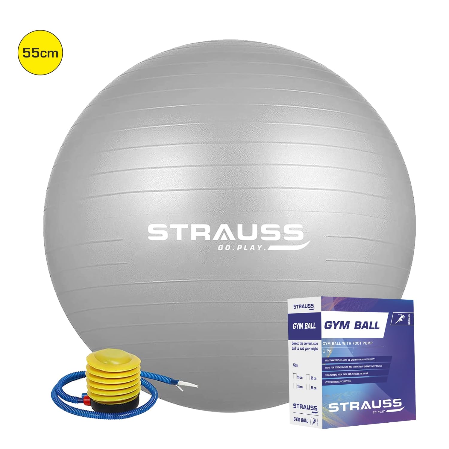 Introducing the STRAUSS Anti-Burst Rubber Gym Ball by Strauss Sports, your essential partner for a balanced workout. This gym ball is 55 cm in diameter, crafted from durable polypropylene material and comes with a convenient foot pump for easy inflation.