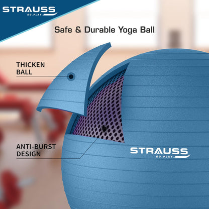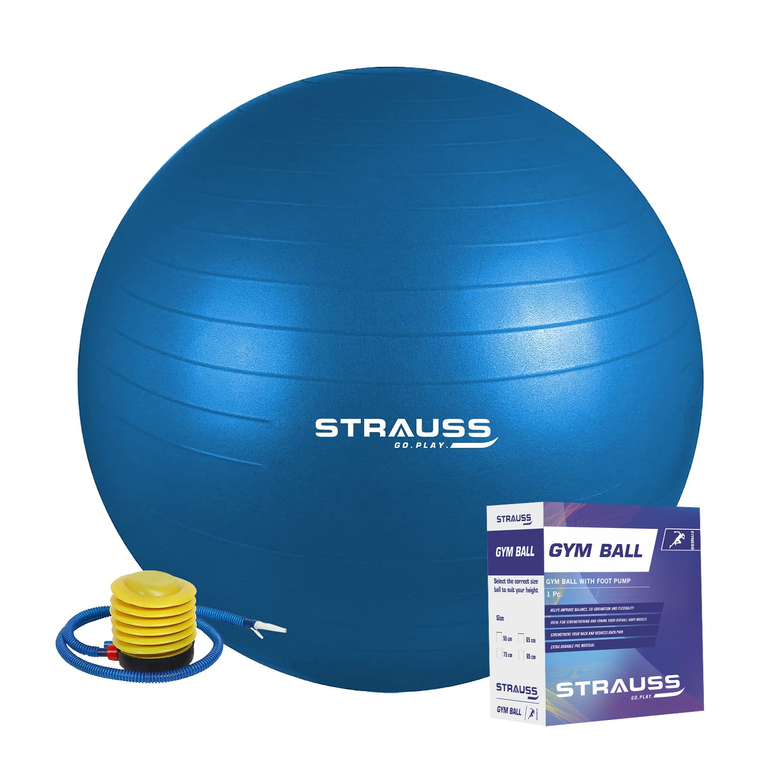 STRAUSS Anti-Burst Rubber Gym Ball with Free Foot Pump | Round Shape Swiss Ball for Exercise, Workout, Yoga, Pregnancy, Birthing, Balance & Stability, 65 cm, (Blue)