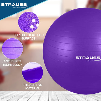 STRAUSS Anti-Burst Rubber Gym Ball with Free Foot Pump | Round Shape Swiss Ball for Exercise, Workout, Yoga, Pregnancy, Birthing, Balance & Stability, 65 cm, (Purple)