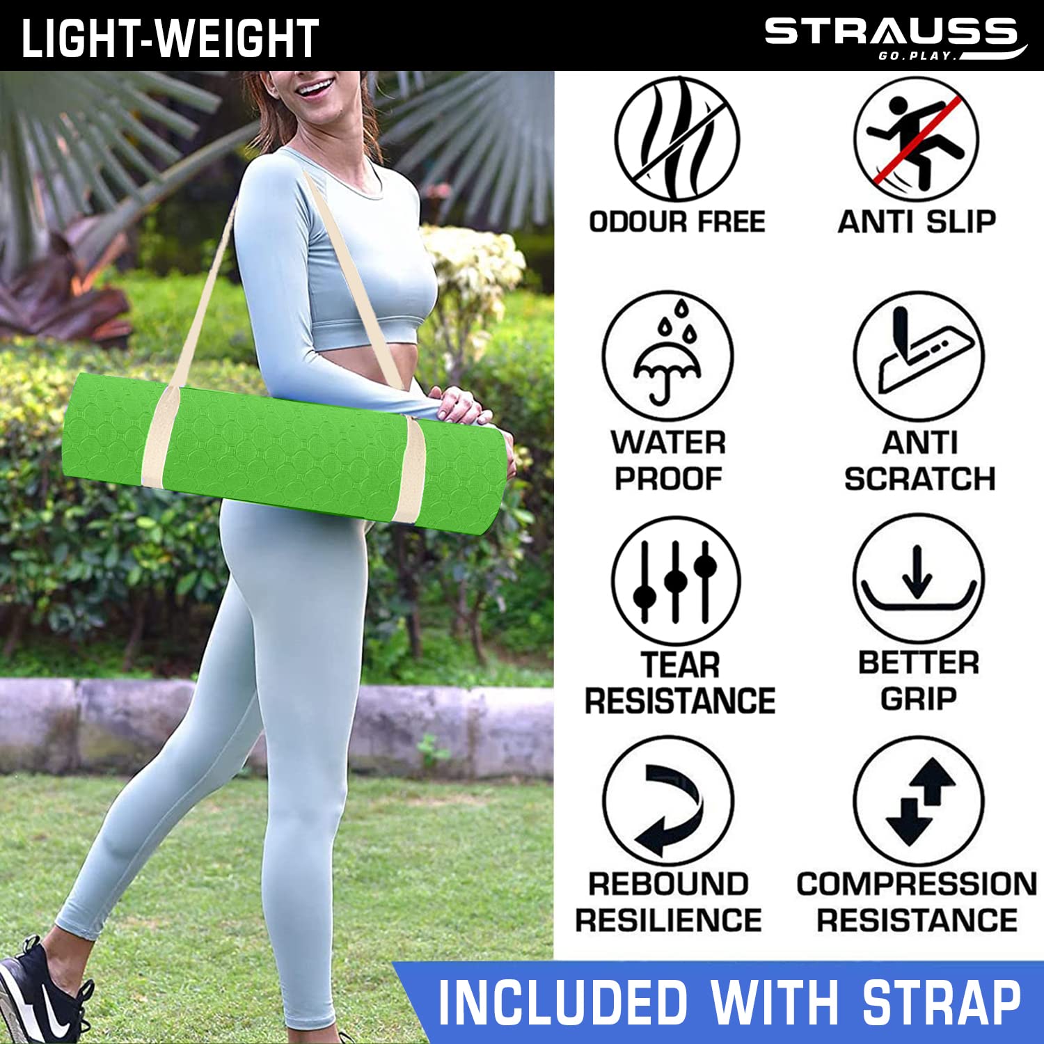 • YOGA MAT WITH STRAP: Lightweight and easy to carry with a strap included.