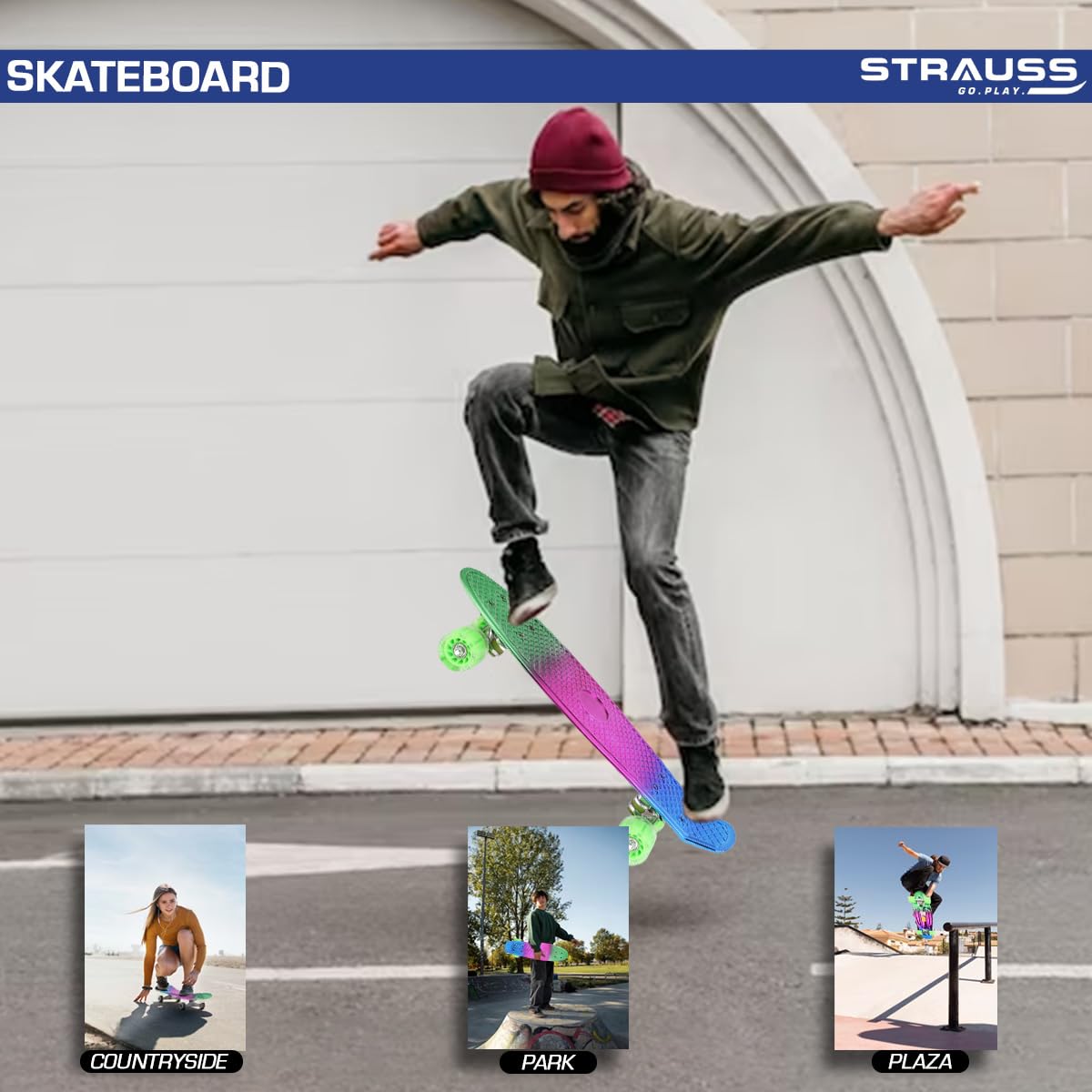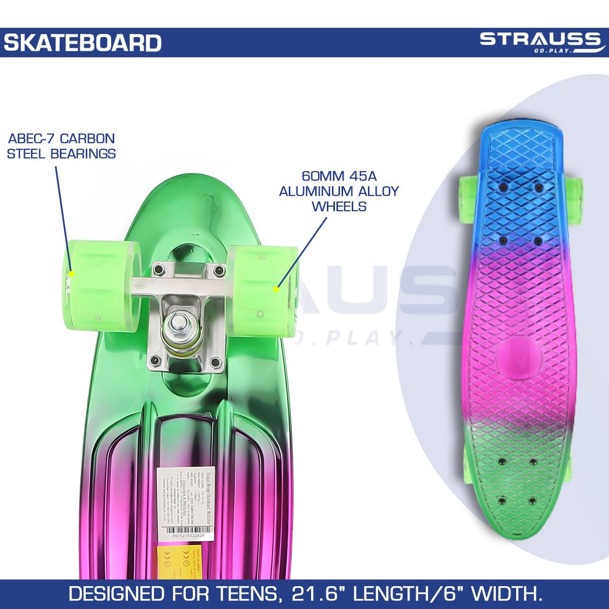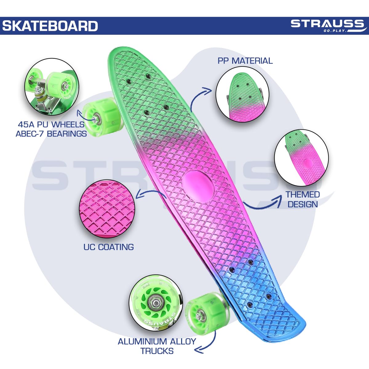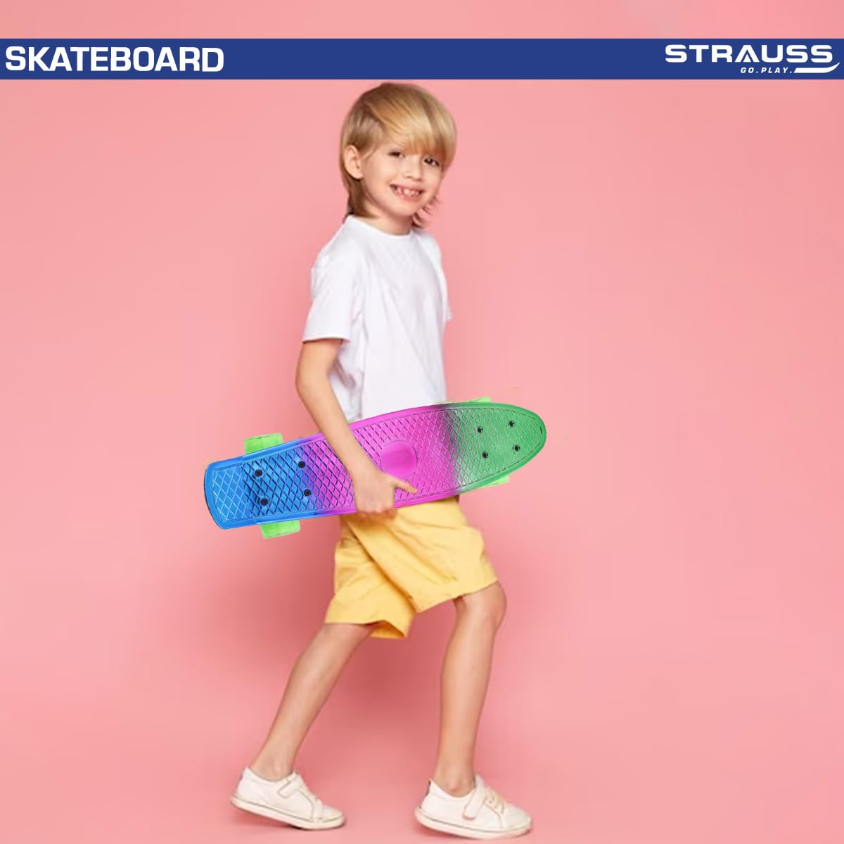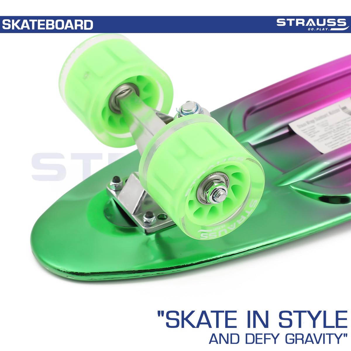 STRAUSS Cruiser Skateboard| Penny Skateboard | Casterboard | Hoverboard | Anti-Skid Board with ABEC-7 High Precision Bearings | Ideal for 8 Years and above | 22 X 6 Inch,(Green,Pink,Blue)