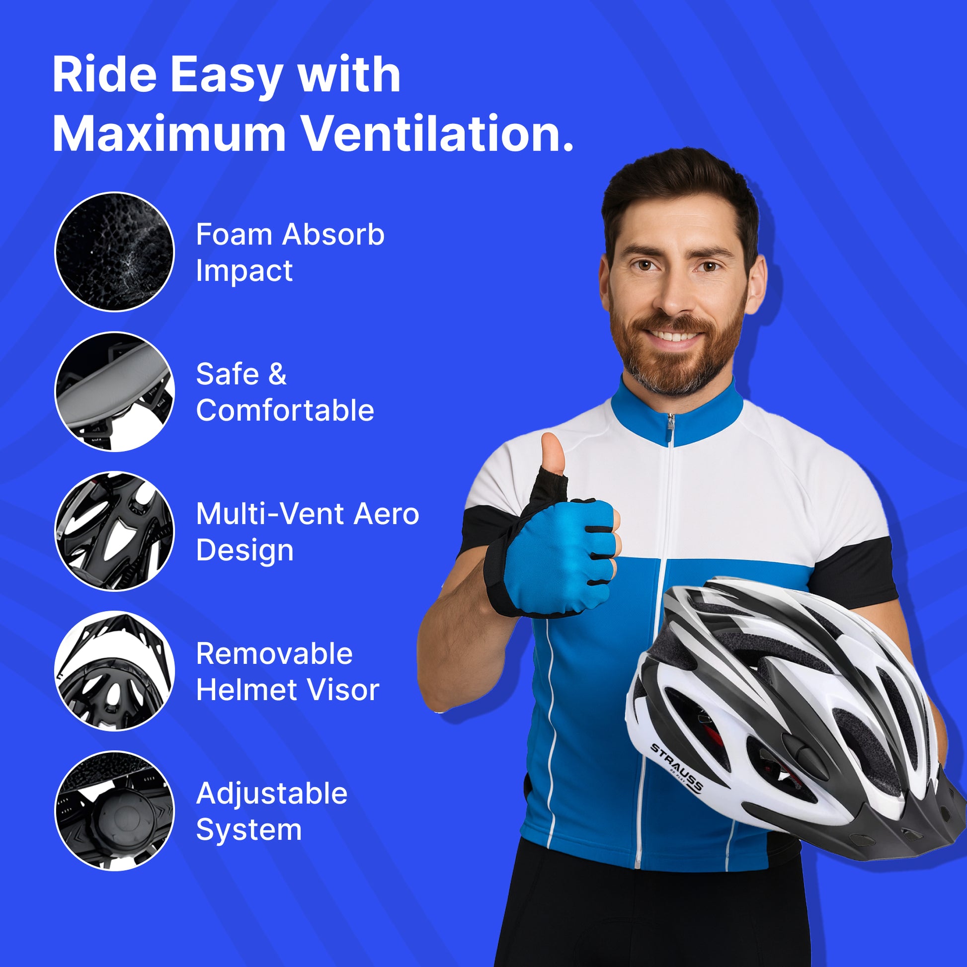 Introducing the Strauss Cycling Helmet, your ultimate companion for cycling adventures by Strauss Sports. This lightweight helmet is designed for both mountain biking and road cycling, ensuring comfort and protection during your rides. With its adjustable strap and comfortable chin pad, it fits a wide range of head sizes (Medium), making it an ideal choice for both men and women. The sleek Black/White design not only looks great but also features a detachable visor for added versatility depending on the riding conditions.