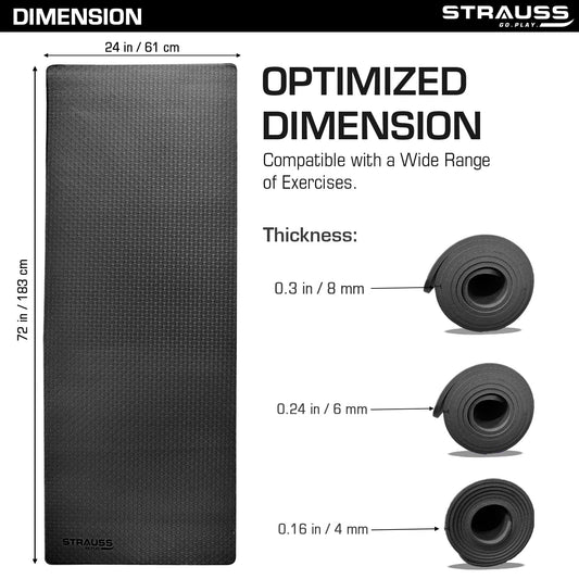 Strauss Anti Skid TPE Yoga Mat with Carry Bag, Exercise Mat for Yoga, Pilates & Gym| Lightweight Yoga Mat for Women and Men |Ideal for Home Gym Workout 8mm, (Black)