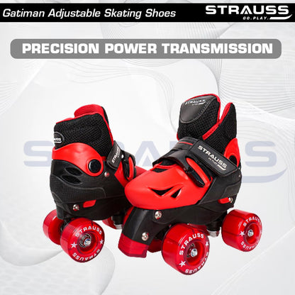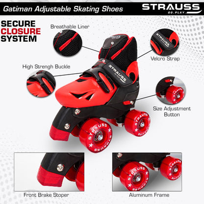 STRAUSS Gatiman Adjustable Skating Shoes | Latest Designed Roller Skates With Break | Ideal For Boys And Girls | Adjustable 4 Wheels Skating Shoe | Size: Sub-Junior (Black/Red), Outdoor Wheel