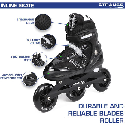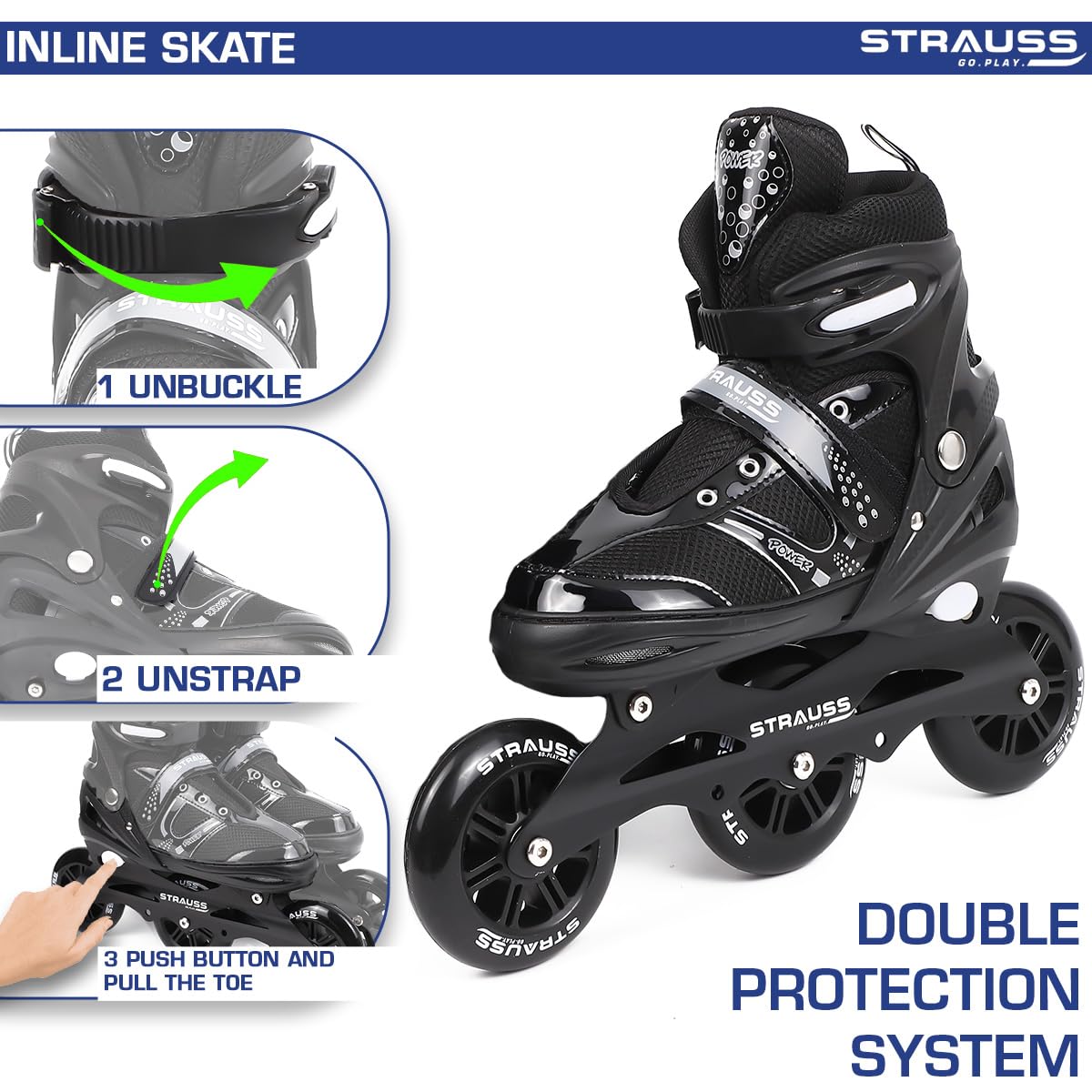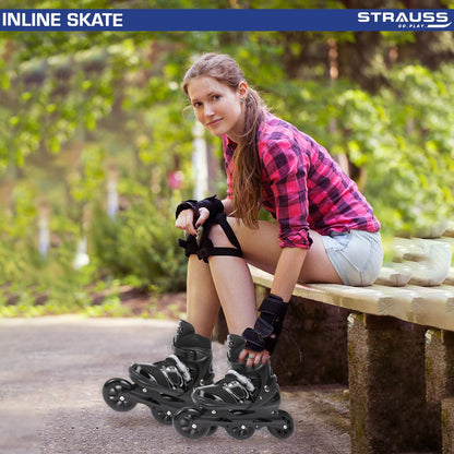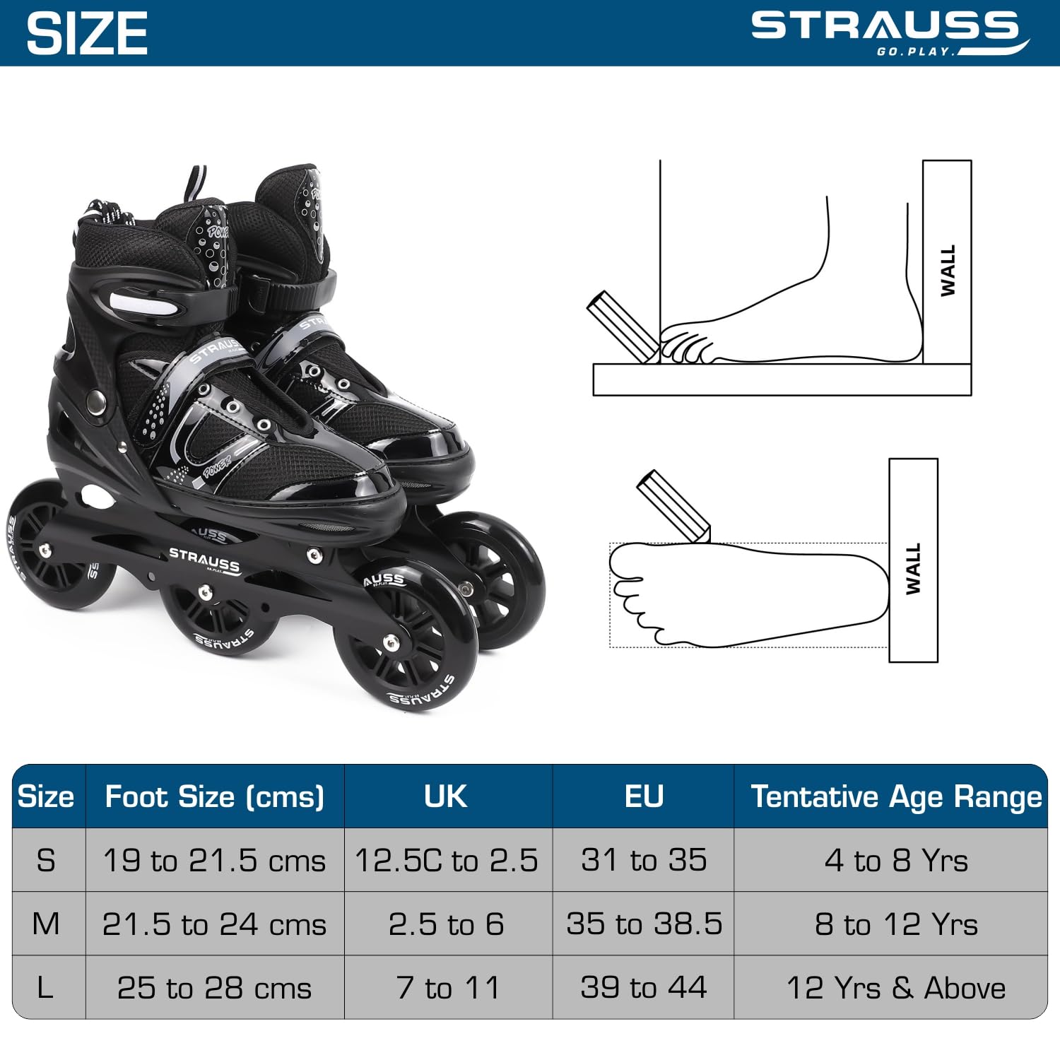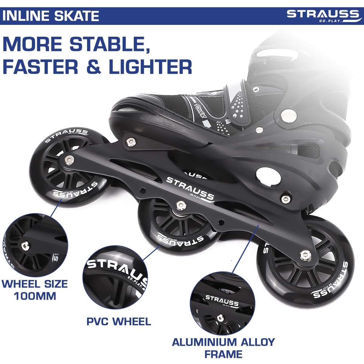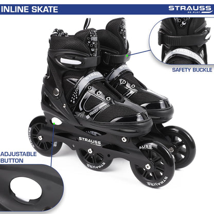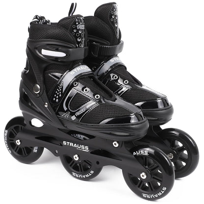 STRAUSS Trinity Adjustable Size Inline Skates | Skating Shoes for Boys & Girls | 3 Wheels |Beginner-Friendly Skating Shoe | Adjustable Roller Blades | Enhanced Stability and Support| Size M,(Black)