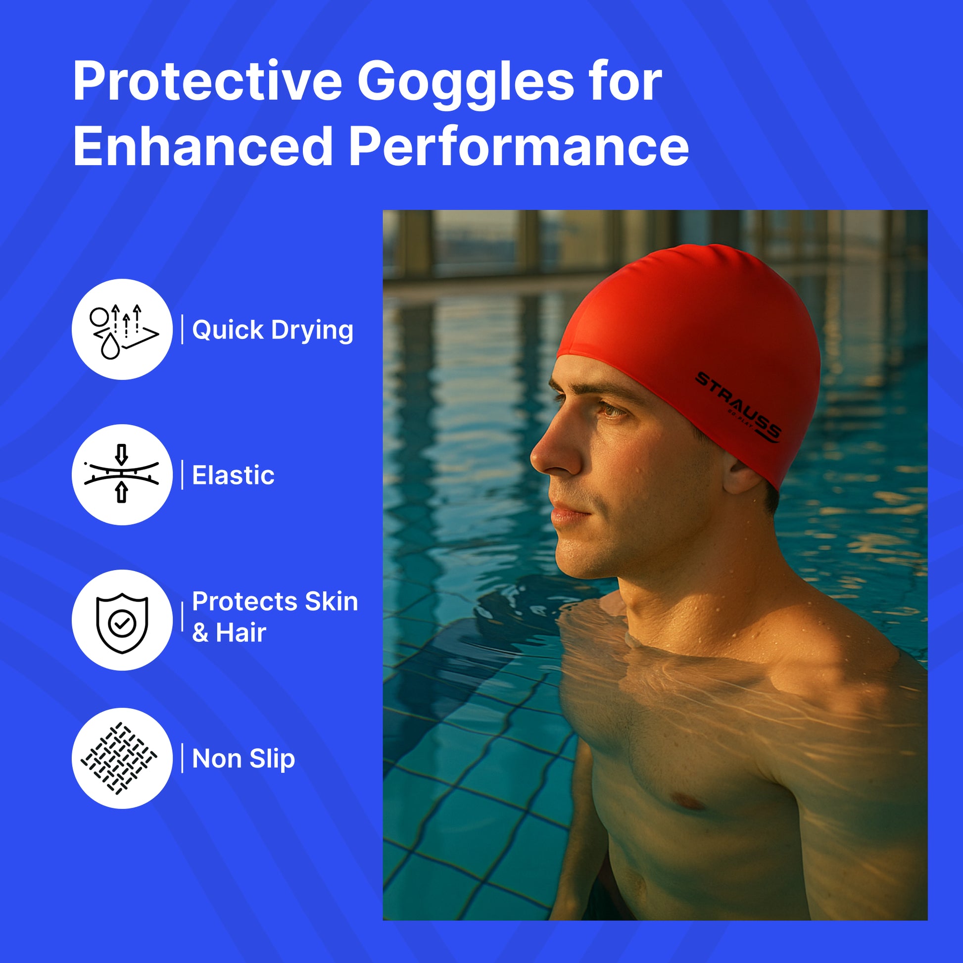 Introducing the Strauss Latest Designed Swimming Cap by Strauss Sports, your ultimate companion for all swimming activities. Crafted from premium breathable plastic, this swim cap is designed to keep your hair clean and dry while ensuring your scalp remains cool and fresh during your aquatic adventures. Suitable for both long and short hair, the cap's advanced design includes an ear protector feature to shield your ears from water exposure and discomfort, making it a must-have for serious swimmers.