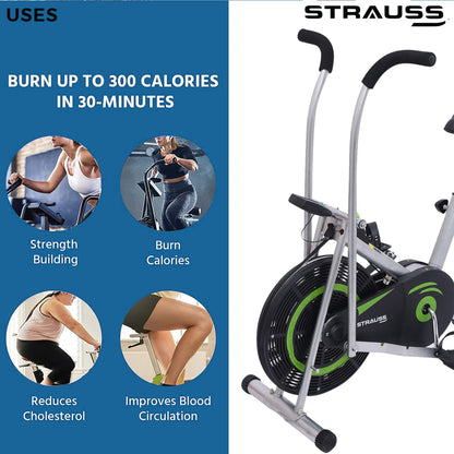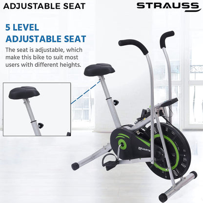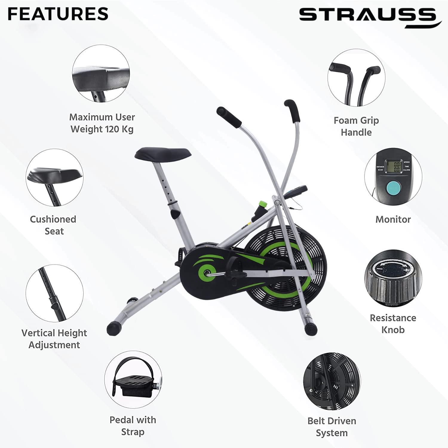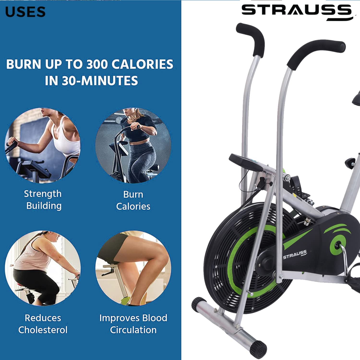 Strauss Stayfit Exercise Bike with Moving or Stationary Handle | Adjustable Resistance with Cushioned Seat and LCD Monitor | Fitness Cycle for Home Gym (Max Weight: 120Kg), Green
