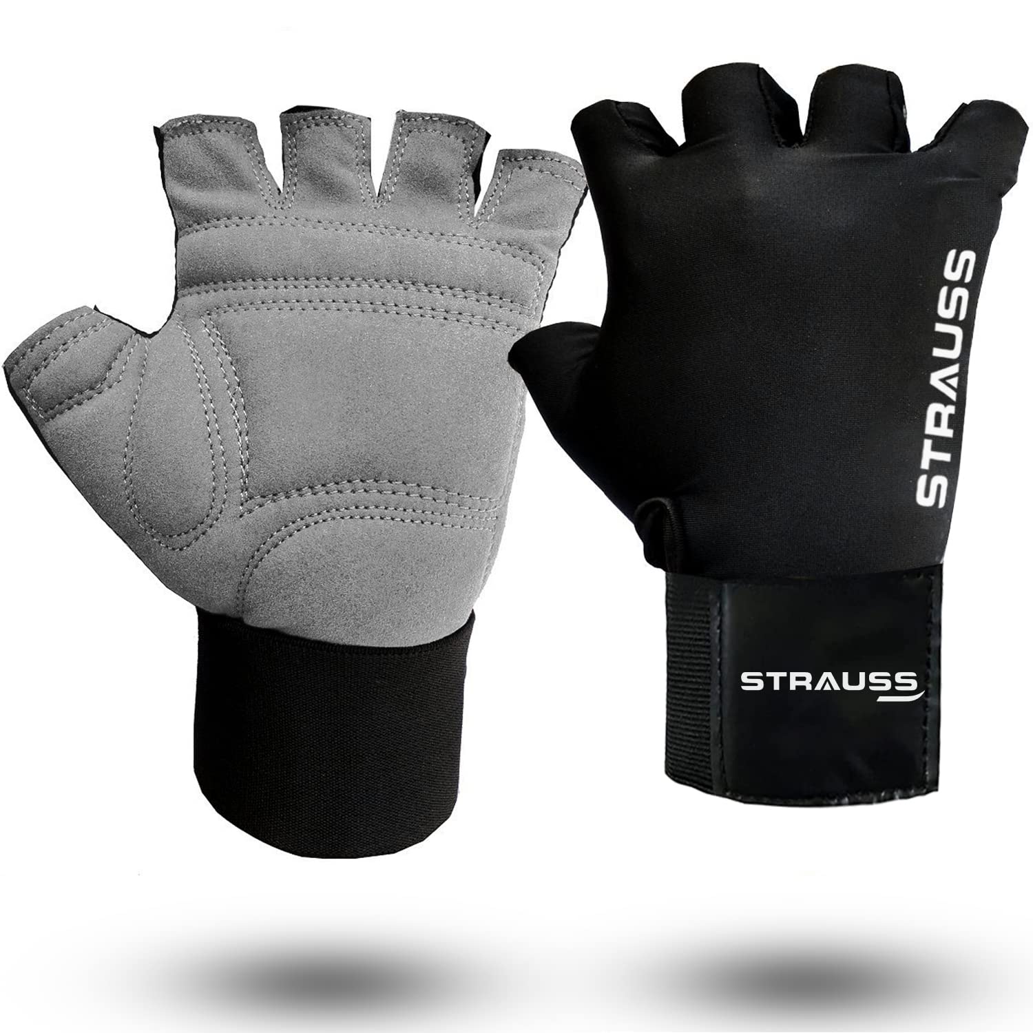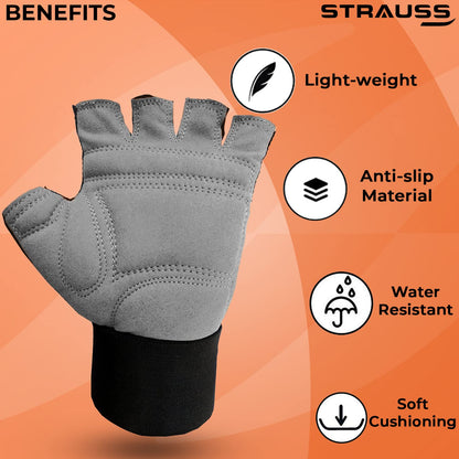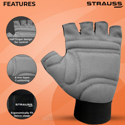 STRAUSS Suede Gym Gloves for Weightlifting, Training, Cycling, Exercise & Gym | Half Finger Design, 8mm Foam Cushioning, Anti-Slip & Breathable Lycra Material, (Grey/Black), (Medium)