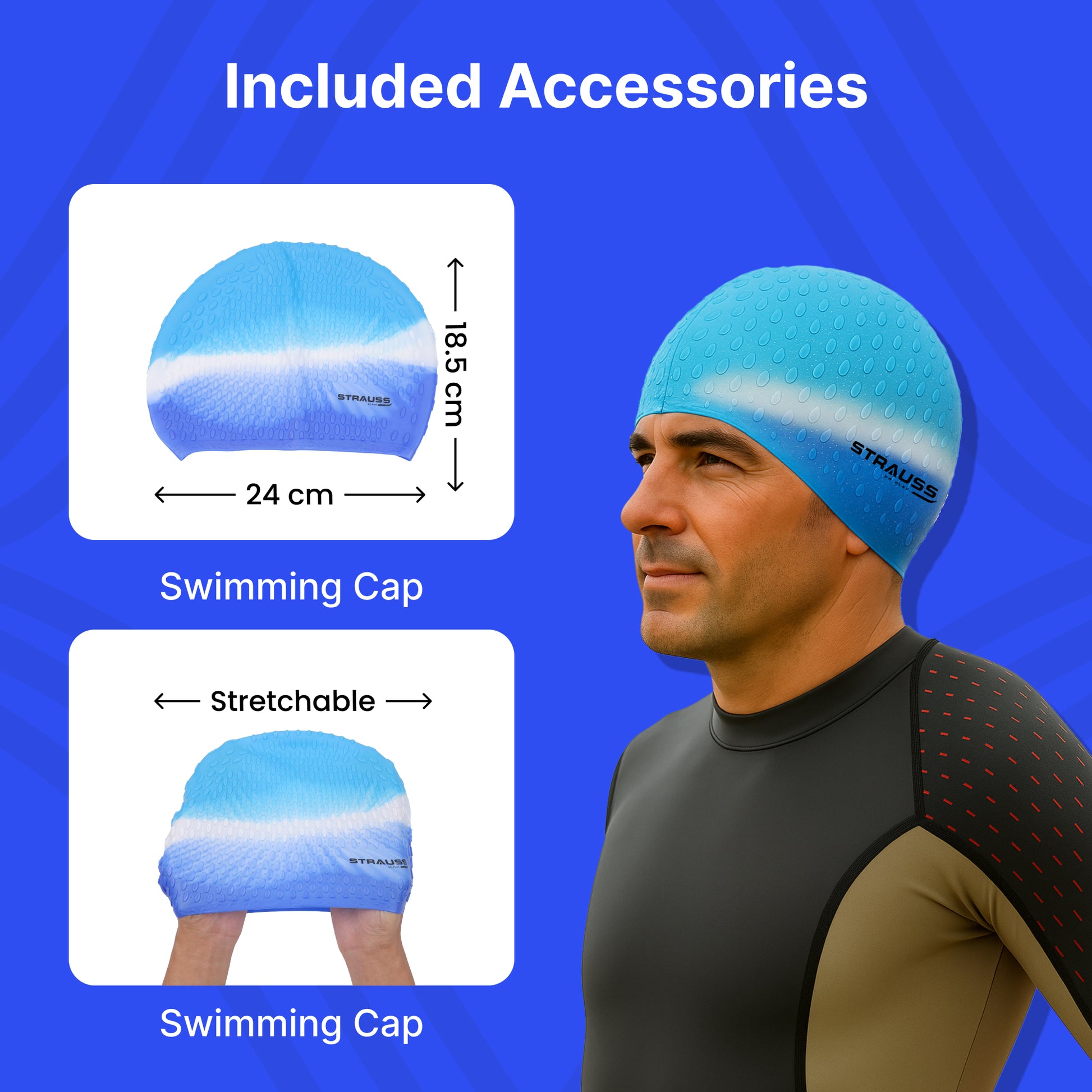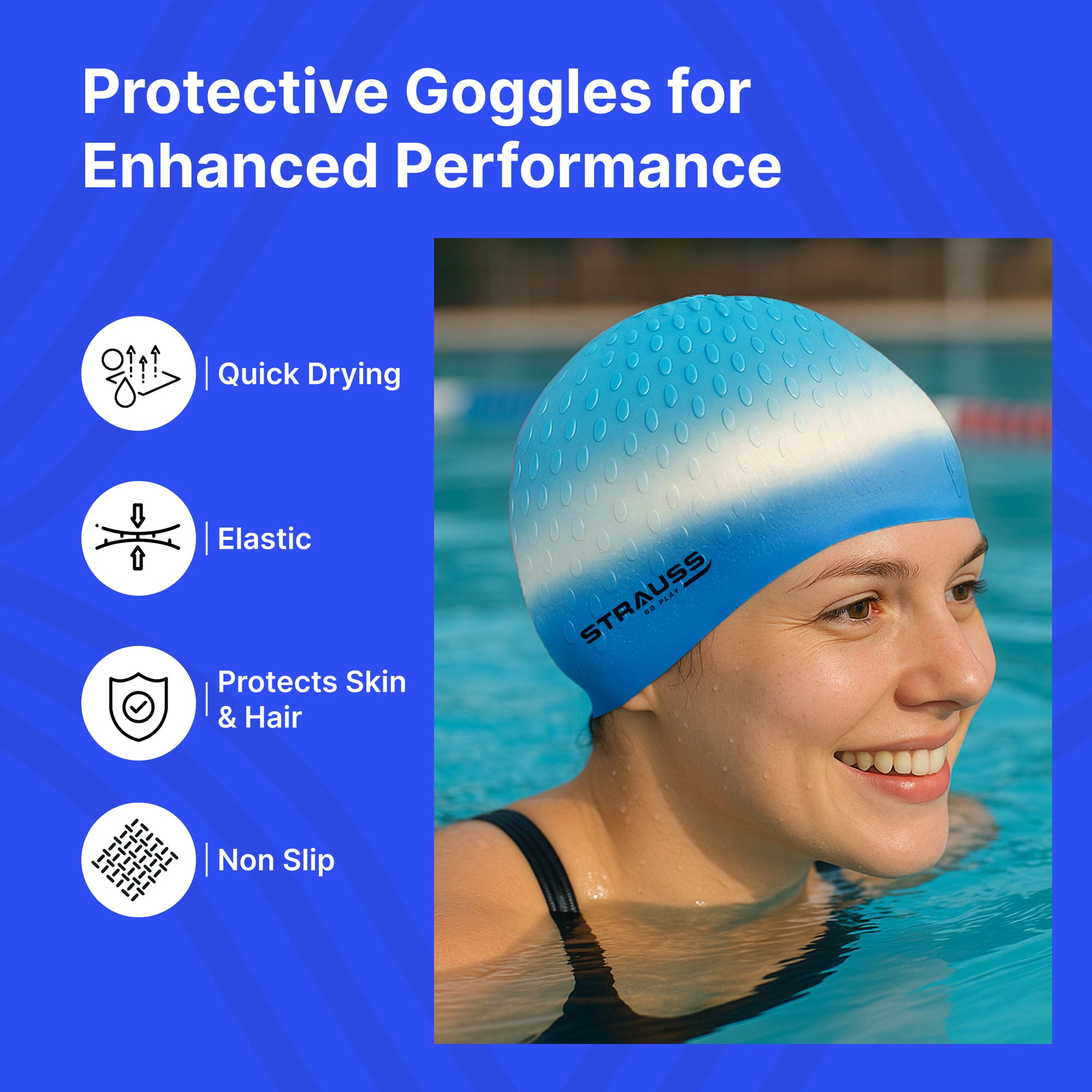 Strauss Swimming Cap - Waterproof, Breathable, Ear Protector | Unisex | Blue