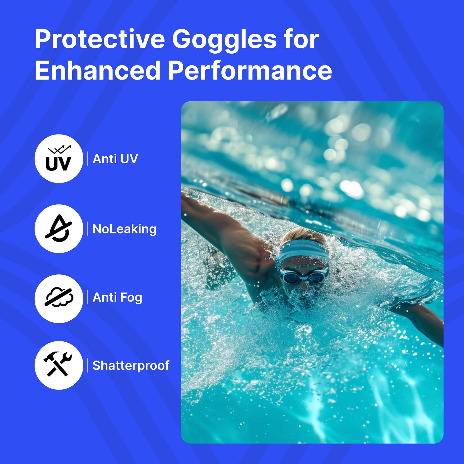 • ANTI-FOG TECHNOLOGY: Don't let foggy lenses ruin your swim. Our advanced anti-fog technology guarantees that your goggles remain crystal clear, allowing you to swim with confidence and without interruptions.