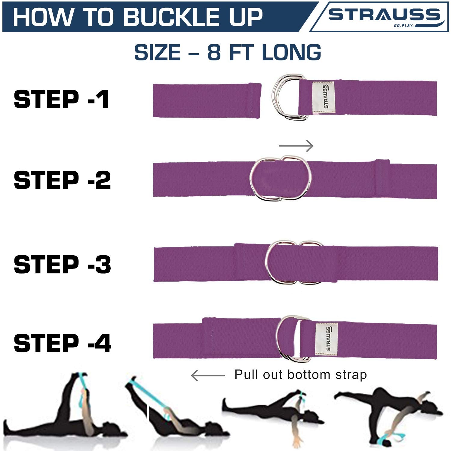 Introducing the Strauss Yoga Strap & Stretching Belt, your perfect companion for enhanced stretching and flexibility. Made with soft and sturdy polyester cotton material, this 8 feet yoga strap provides optimal resistance and holds its shape, ensuring durability as you progress in your practice. The strap comes in a soothing Purple color and features an extra safe adjustable metal D-ring buckle for secure handling. Ideal for yoga, Pilates, therapy, dance, and gymnastics, it's designed to assist you in achieving deeper stretches and improved flexibility.