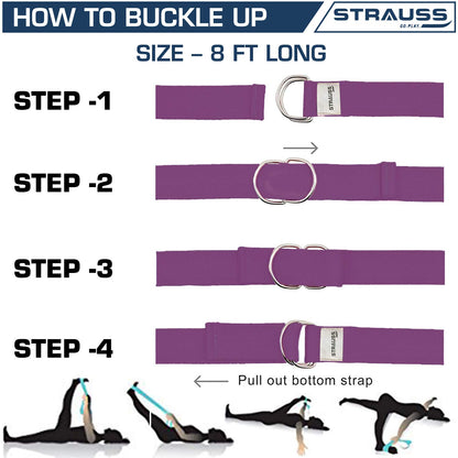 Strauss Yoga Strap & Stretching Belt | Ideal for Yoga, Pilates, Therapy, Dance, Gymnastics & Flexibility | 60% Thicker Belt with Extra Safe Adjustable Metal D-Ring Buckle | Eco-Friendly, 8 feet (Purple)