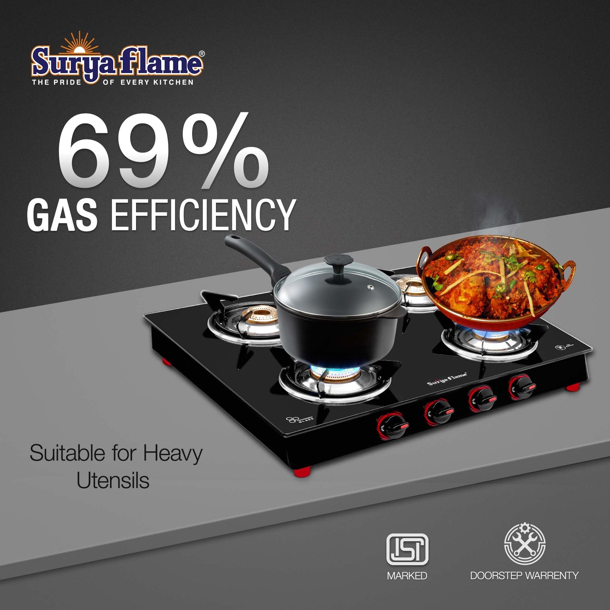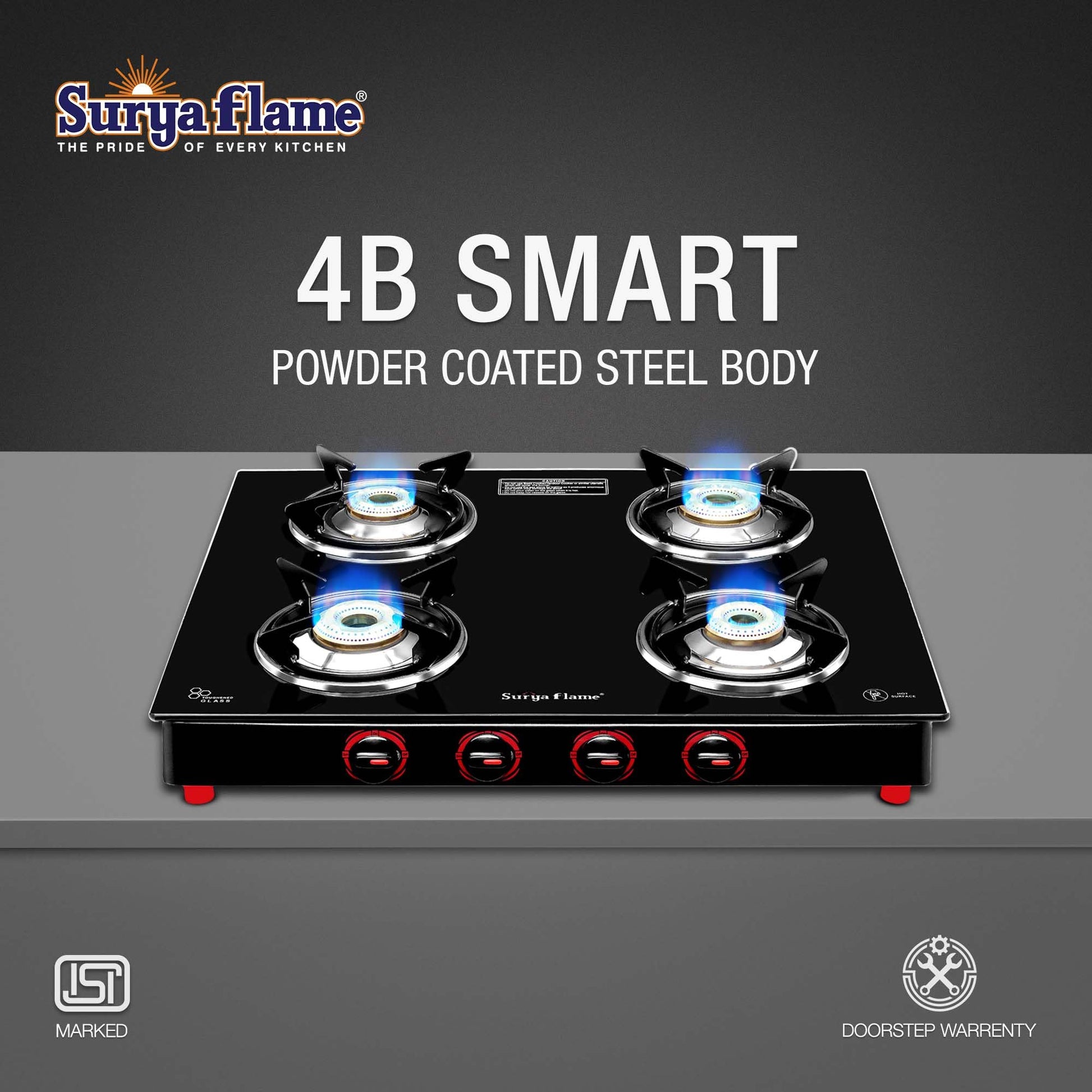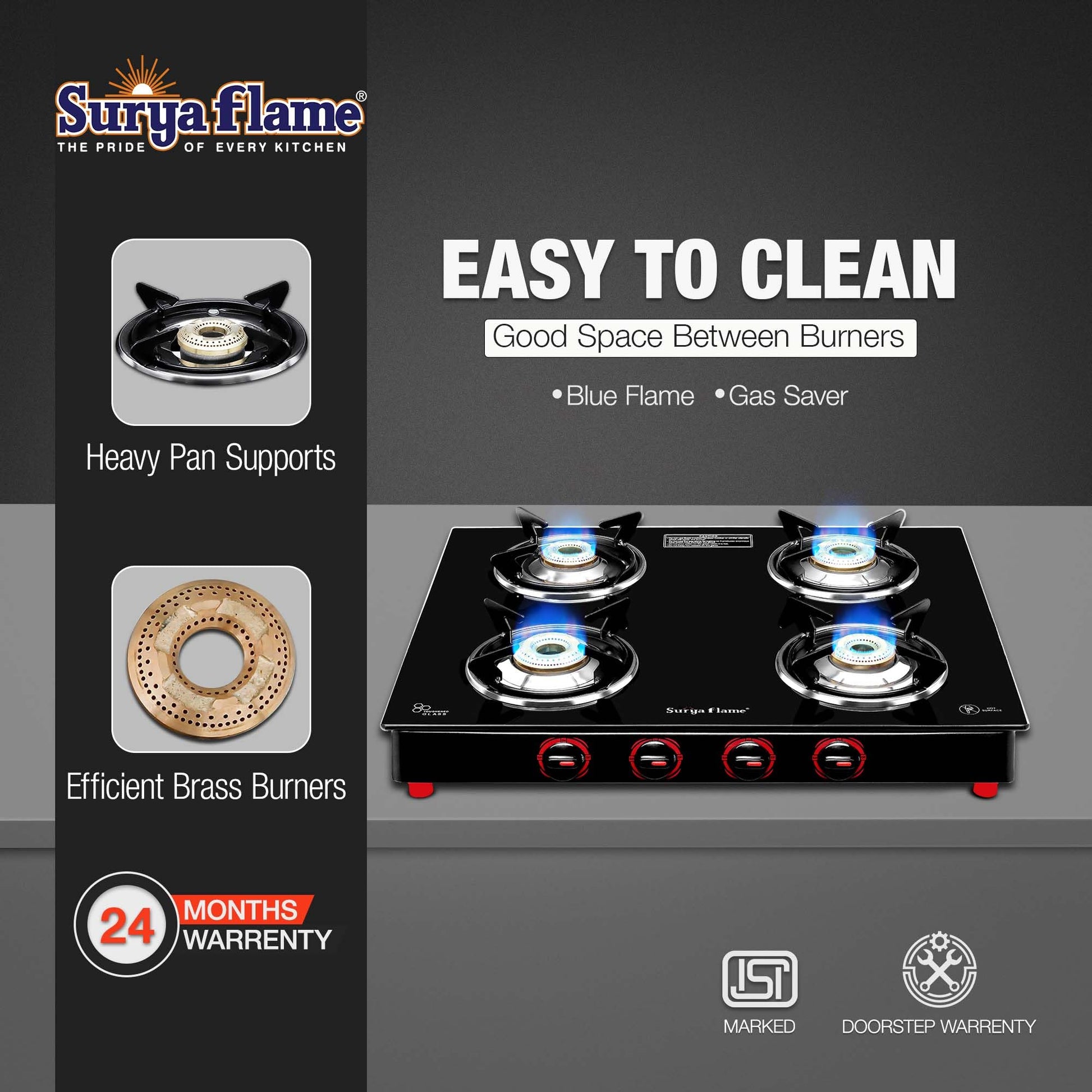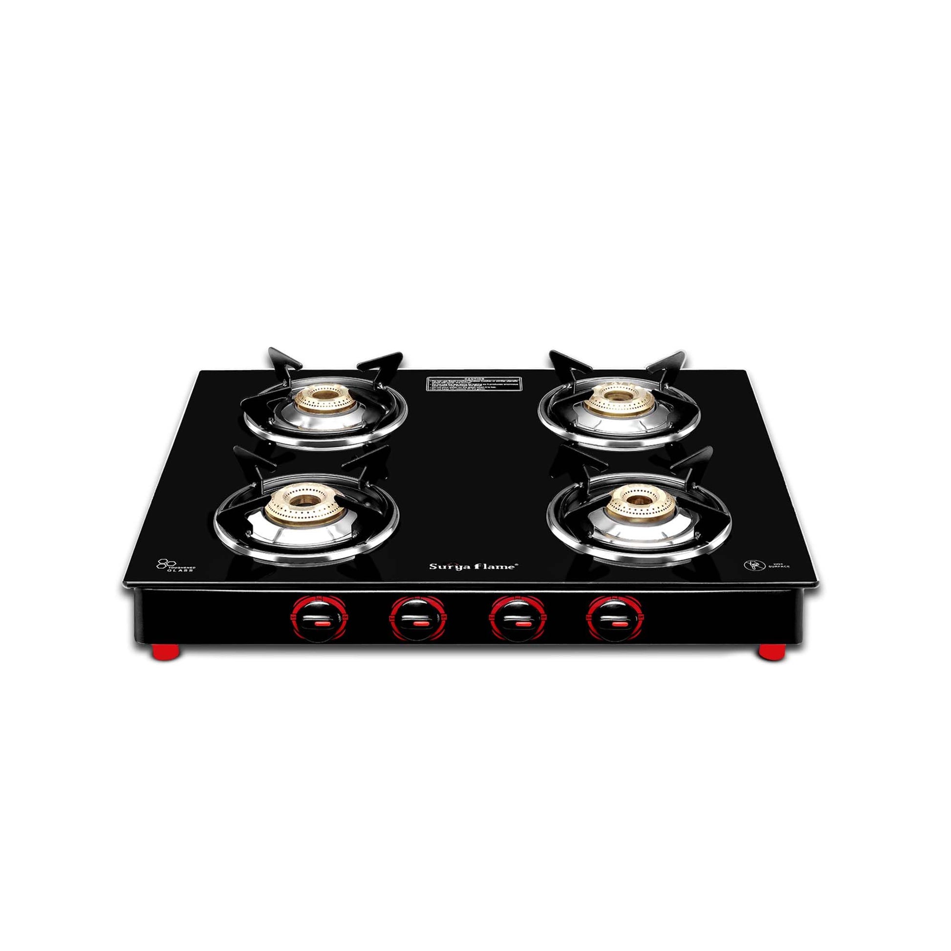 Surya Flame LPG Gas Stove 4 Burner with Brass Smart Glass Top Cooktop ISI Certified Doorstep Services 2 Years (Double Burner Black)
