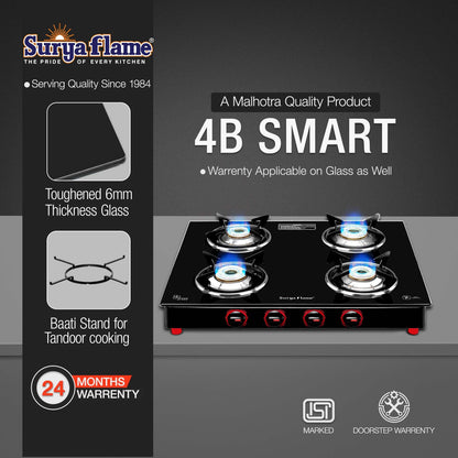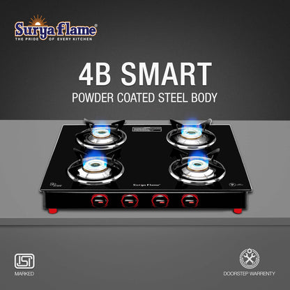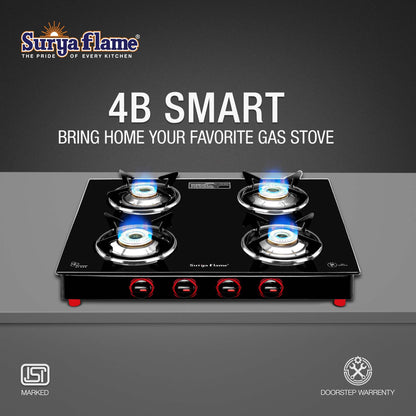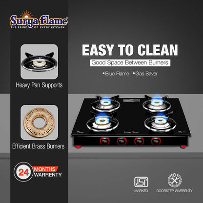 The Surya Flame LPG Gas Stove is designed for those who value efficiency and style in their kitchen. This 4 Burner cooktop combines advanced features with a sleek design to enhance your cooking experience.