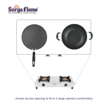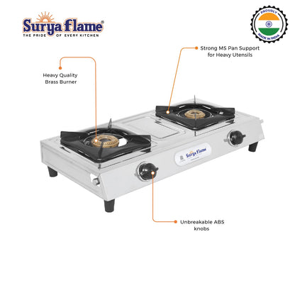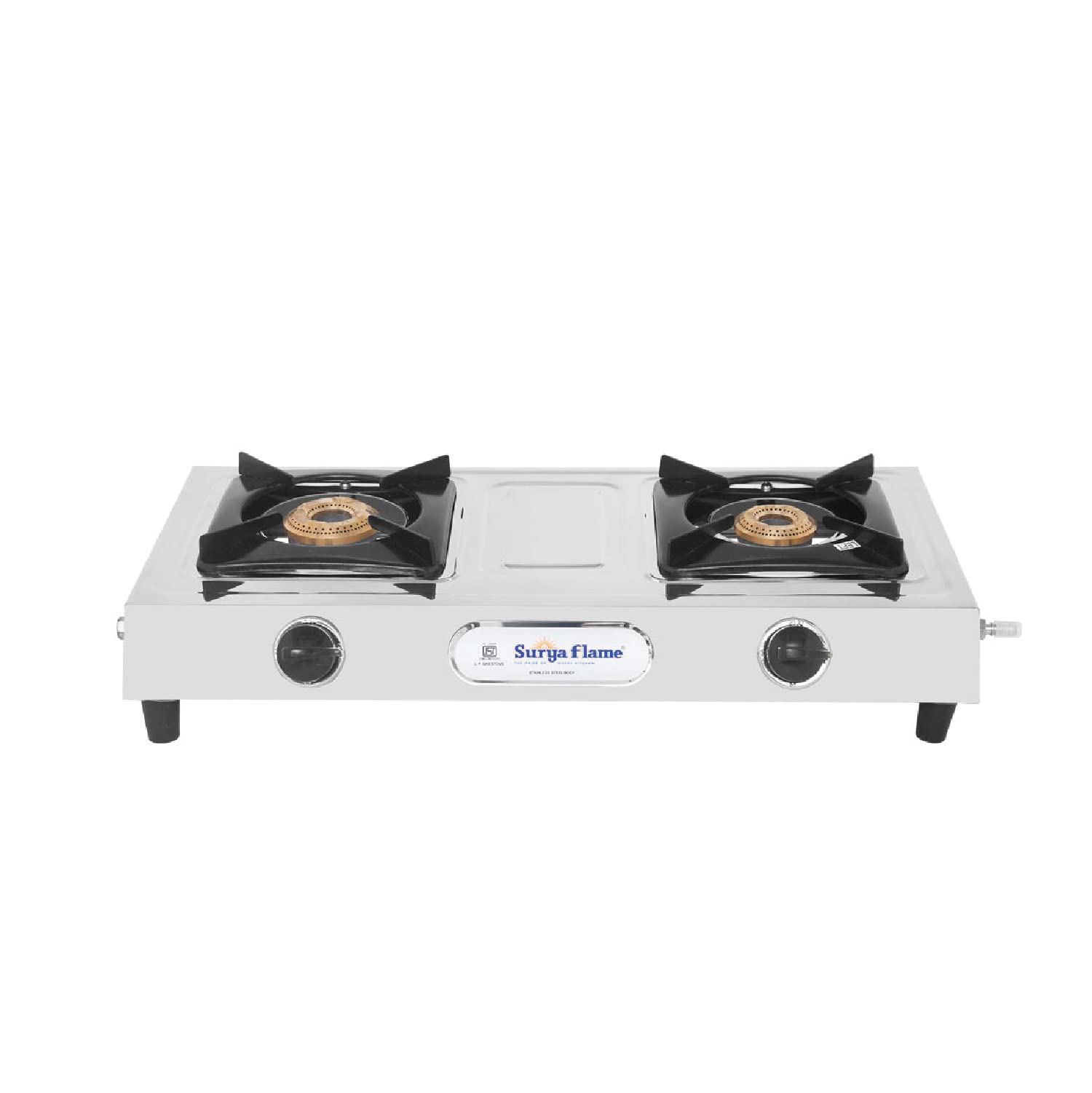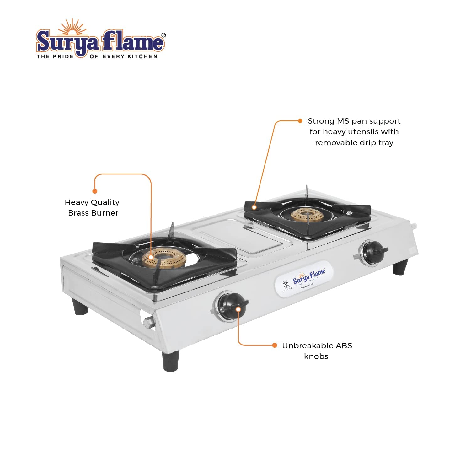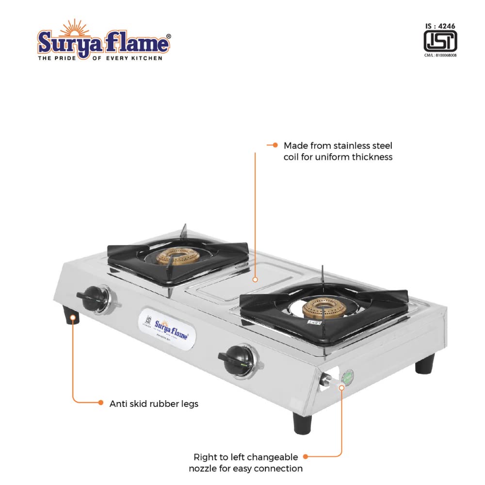 Surya Flame Venus Gas Stove 2 Burners | Stainless Steel Body | Manual LPG Stove With 69% Thermal Efficiency | Anti Skid Rubber Legs - 2 Years Complete Doorstep Warranty