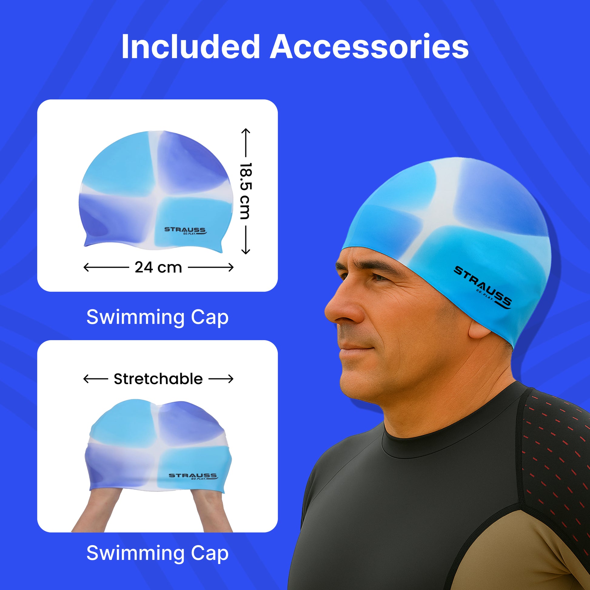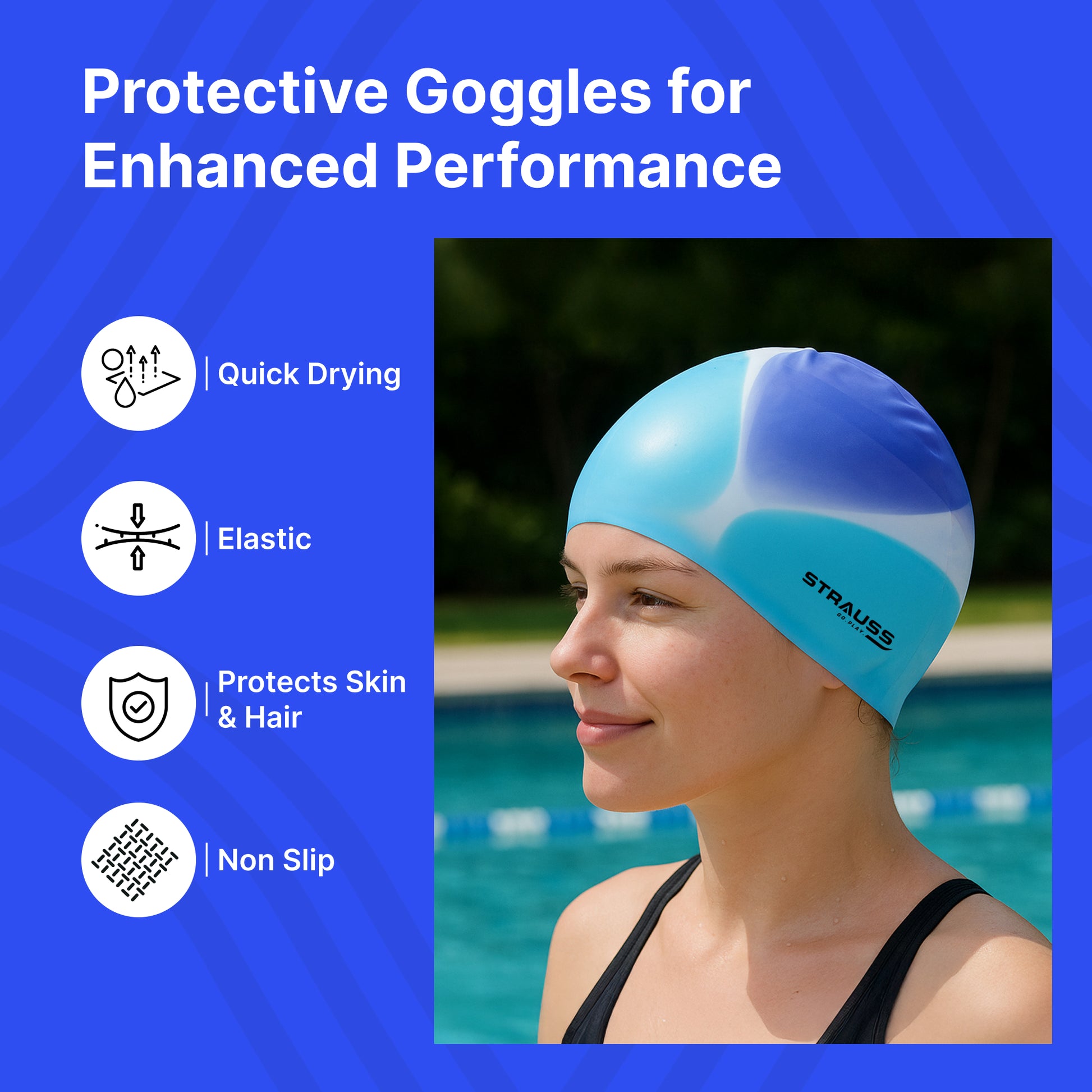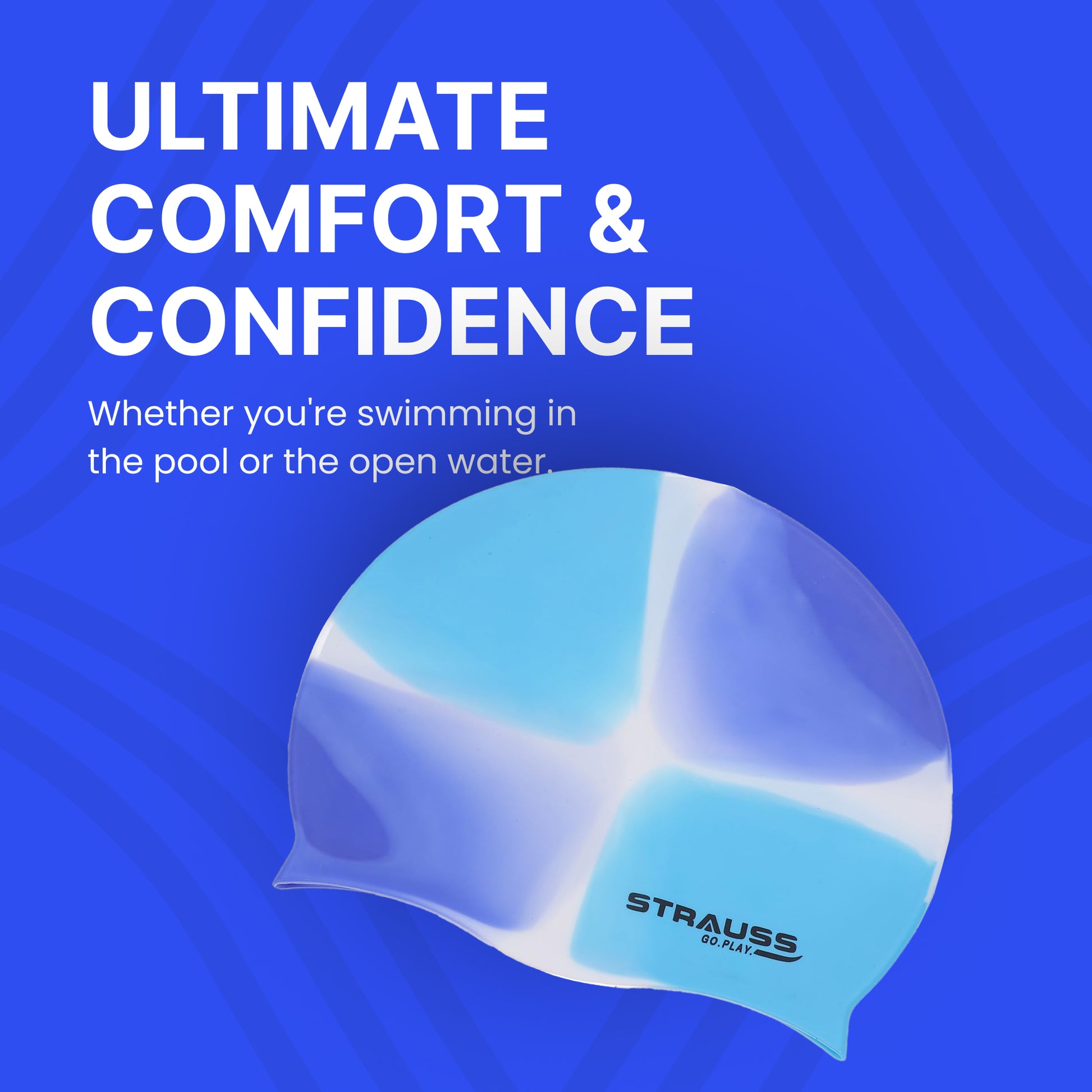 Introducing the Strauss Latest Designed Swimming Cap by Strauss Sports. This exceptional swim cap features a sleek and vibrant Multicolor Blue design that not only enhances your appearance but also delivers unparalleled functionality. Crafted from premium, breathable fabric, it provides the comfort you need for those intense swimming sessions while keeping your hair protected. This swim cap is designed to accommodate both long and short hair comfortably, allowing every swimmer to enjoy their experience without the hassle of a soggy mane.