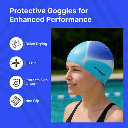 Strauss Latest Designed Swimming Cap | Keeps Hair Clean with Ear Protector | Suitable for Long and Short Hair | Swimming Head Cap with Breathable Fabric | Swim Cap for Adult,(Multicolor Blue)