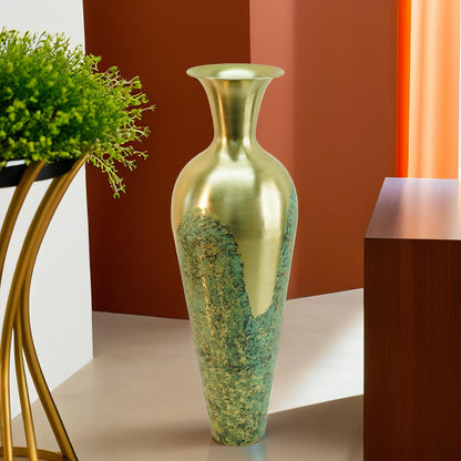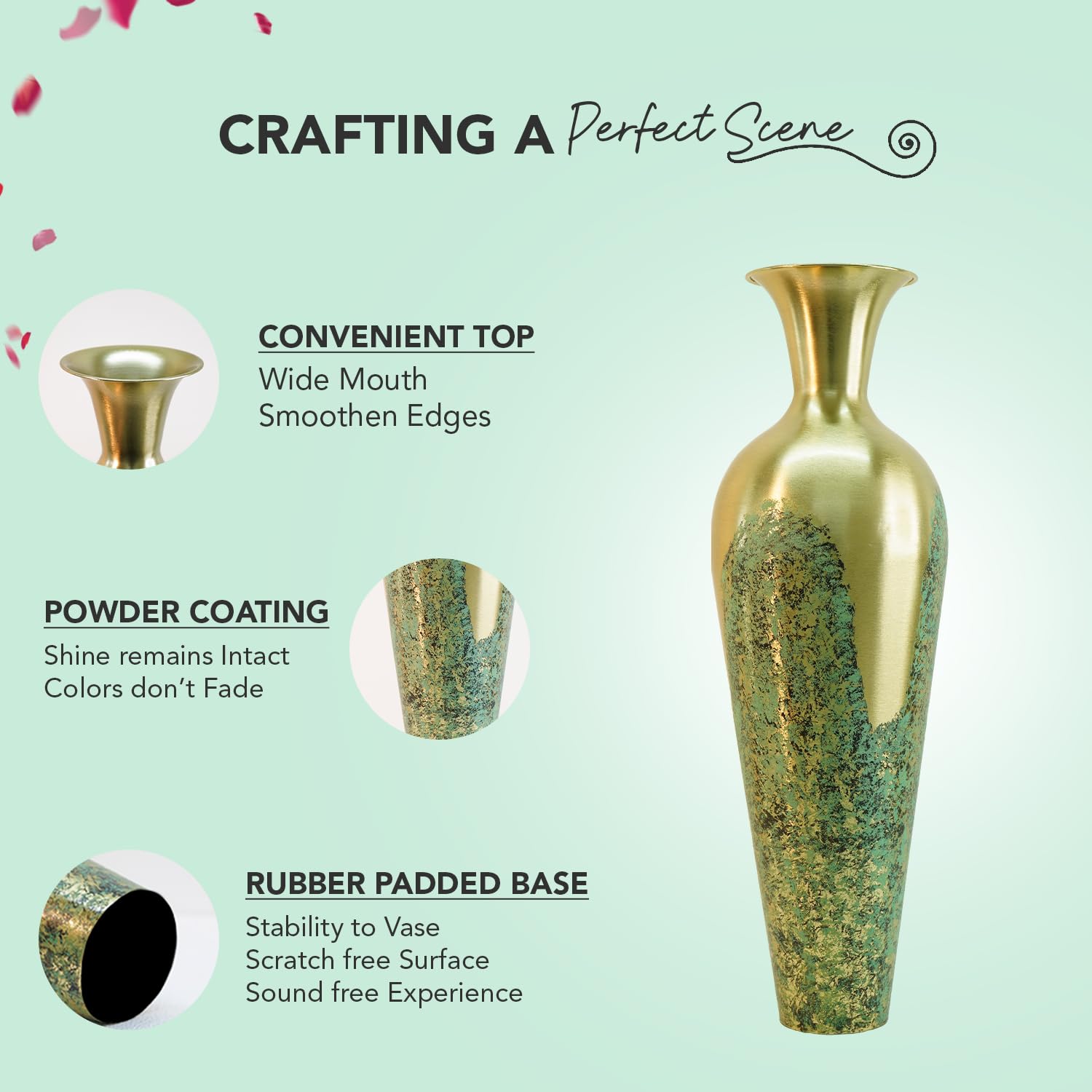 Tall Big Metallic Flower Vase for Home Decor | Abstract Long Flower Vase Gift for Weddings, Housewarming | Large Sofa Side Metal Vase for Living Room, Office, Bed Corner (Green & Gold)