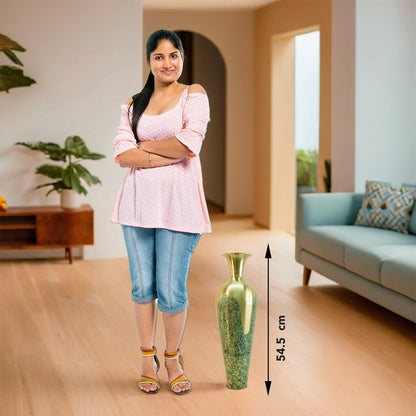 Introducing the Ekhasa Tall Big Metallic Flower Vase for Home Decor, your go-to solution for stylishly enhancing your surroundings. This elegant large vase comes in an eye-catching green and gold finish, crafted from durable metal to ensure longevity and grace. Perfect for various spaces, it serves as an ideal centerpiece for your living room, office, or bedroom with its standout size and design.