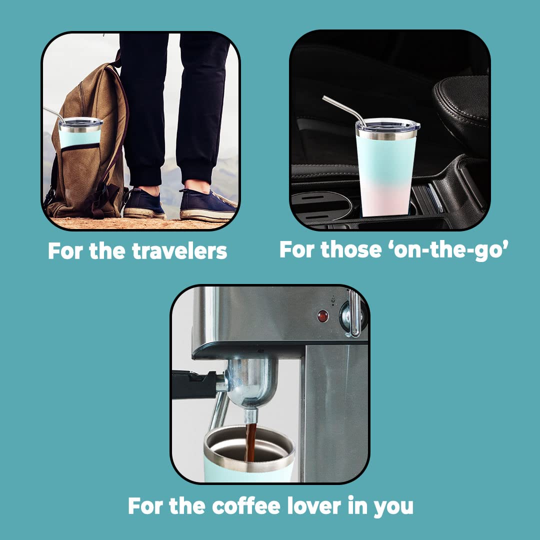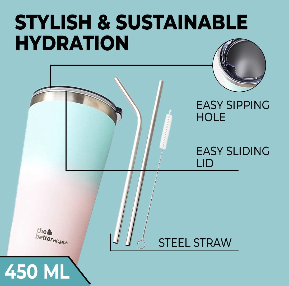 The Better Home Pack of 2 Insulated Coffee Tumbler with straw & Stainless-Steel Bottle | Double-Walled 304 Steel | Leakproof | Ideal for Travel Home Office | 6 hrs Hot & Cold | Blue-Pink EASY TO CARRY, CLEAN & STORE INSULATED WATER BOTTLE: Unlike plastic bottles that can develop a yellow tint with long-term usage, our Stainless Steel Water Bottle is very easy to keep hygienic and can be cleaned with hot water and dish soap just like your other kitchen items. HOT AND COLD STEEL WATER BOTTLE FOR KIDS AND ADULTS Our insulated steel bottle comes with a double wall technology that keeps your water cold for 24 hours and hot for 18 hours so that you can sip through the day without worry. It can also be used as a flask for tea, coffee or other beverages! LEAK-PROOF AND EASY TO USE STEEL WATER BOTTLE: This flask water bottle’s ergonomic design, shatter-proof and leak-proof features make it the perfect companion that will keep you hydrated on the go. FAMILY SAFE & ECO-FRIENDLY FLASK: Our 8/18 304 Food Grade Insulated Stainless Steel Bottle is Rust-free and super durable. Our insulated stainless steel bottle is the ultimate sustainable choice for your family and can be reused everyday without any waste. INSULATED COFFE MUG WITH LID & HANDLE: The Better Home coffee mugs are made with high grade stainless steel & have double wall insulation. This ensures that your coffee or tea remains hot (or cold) for up to 6 hours. It also retains the taste longer by allowing no contact with outside air. SPILL PROOF TRAVEL COFFEE MUG: These mugs for coffee or tea come with a silicone rim on the lid, making them airtight, thus ensuring a leak-proof sipping experience. It is the perfect insulated travel coffee mug MULTI-UTILITY COFFEE FLASK: This stylish coffee flask is ideal to carry around on long road trips, in offices, in the car, or to simply relax at home. This coffee sipper is sure to amp up your style quotient! DURABLE AND RUST PROOF: The coffee flask is thoughtfully designed with every detail in mind. The double walls ensure no sweat on the outer body, making it easier to hold. The material is rust-proof which also makes it super durable and long-lasting. ANTI-SLIP DOUBLE WALL COFFEE MUG: The Better Home coffee mugs have a unique non slip girp to ensure that you never burn your hand while holding hot beverages, and also prevents accidental spillage of your coffee or tea. The coffee tumbler is ergonomic and designed to help elevate your daily coffee experience.