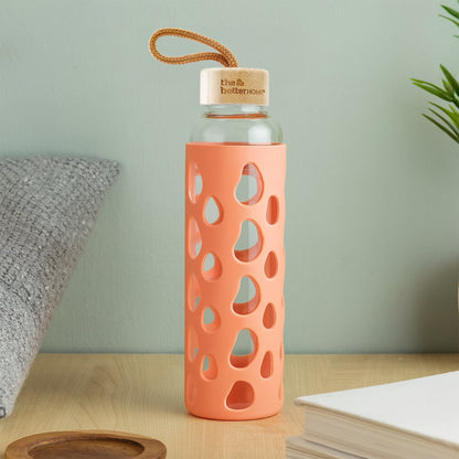 The Better Home Borosilicate Glass Water Bottle with Sleeve (550ml) | Non Slip Silicon Sleeve & Bamboo Lid | Water Bottles for Fridge (1Pcs - Coral)