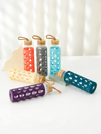 Borosilicate Glass Water Bottle with Sleeve (550ml) | Non Slip Silicon Sleeve & Bamboo Lid | Water Bottles for Fridge (1Pcs - Coral)