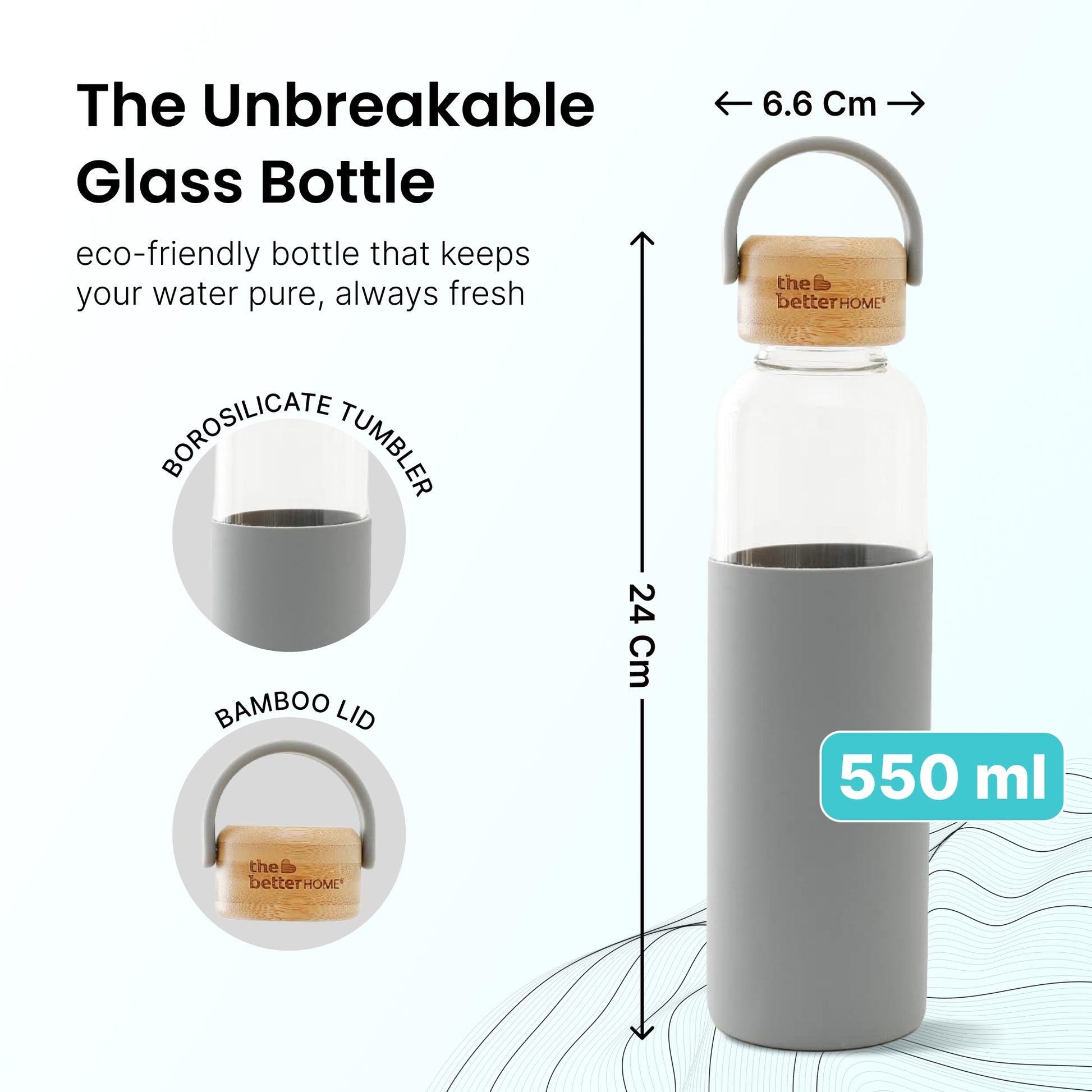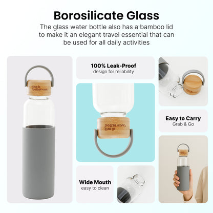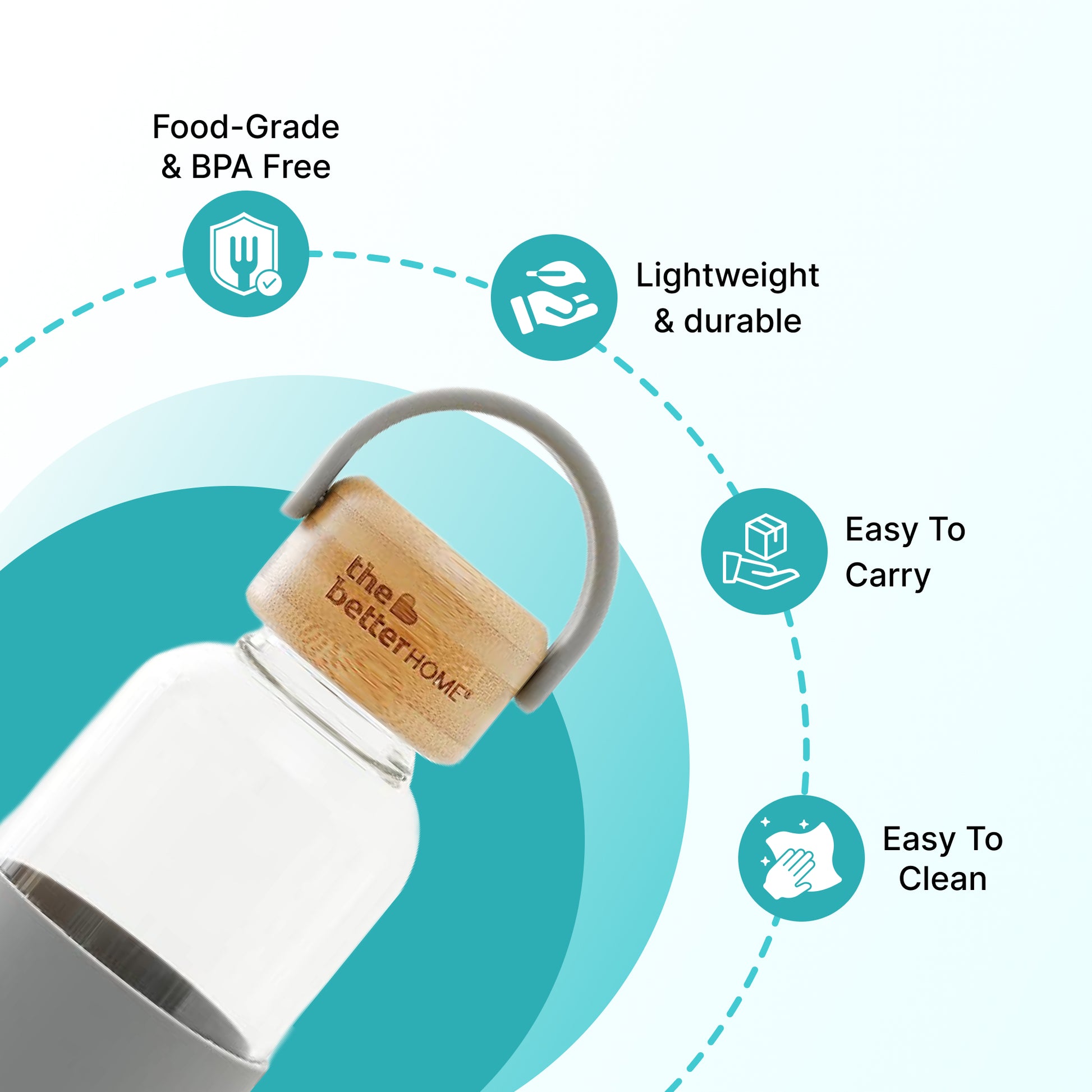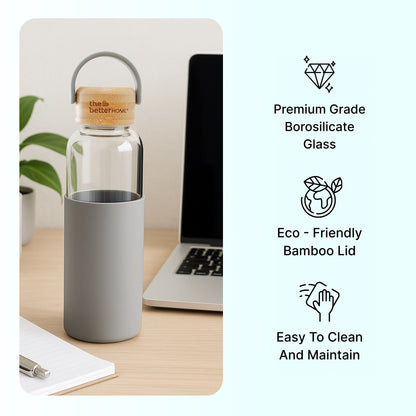 Borosilicate Glass Water Bottle (500ml) with Bamboo Lid & Silicon Sleeve for Fridge, Home, Office & Gym (Grey, Pack of 1)