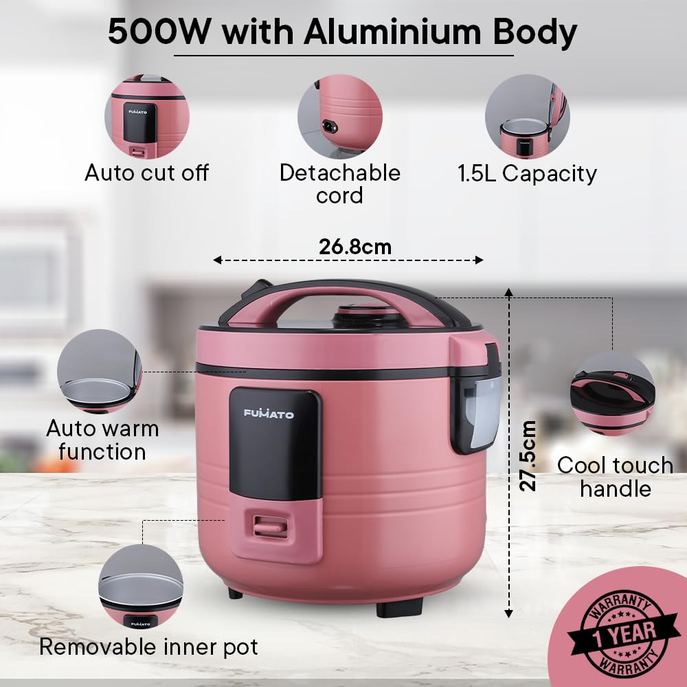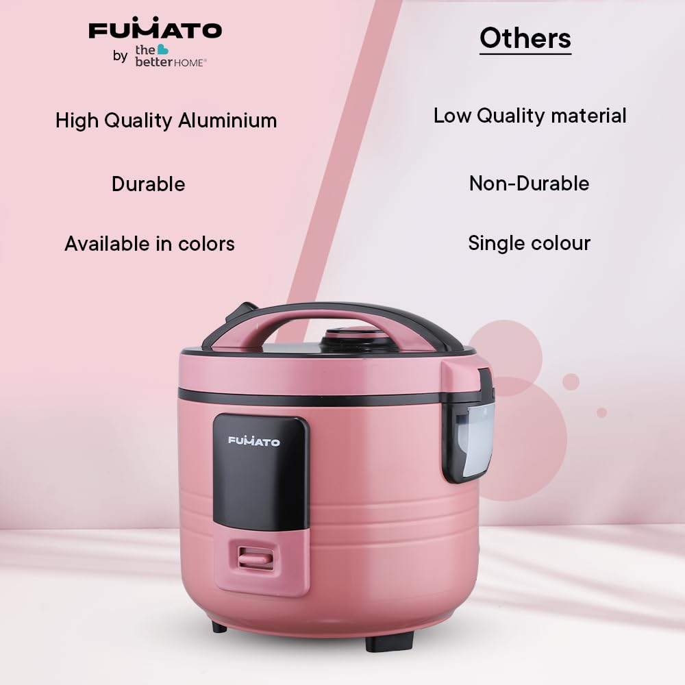 The Better Home FUMATO Slow Rice Cooker 1.5L 500W | 3-in-1 Electric Cooker, Boiler & Steamer | Aluminum Pot, Keep Warm Function, Cool Touch Body, Measuring Cup | 1 Year Warranty (Cherry Pink)