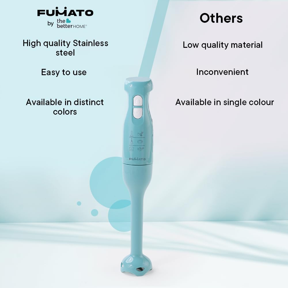 Introducing the Fumato's Kitchen and Appliance Combo by The Better Home, a revolutionary addition to your kitchen that enhances your culinary experience. This innovative set includes a hand blender, complete with a 680ml glass container and a 410ml airtight container, all made from high-quality food-grade materials. The elegant light blue color adds a modern touch to your kitchen decor.