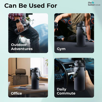 The Better Home Scout Series Insulated Water Bottle 1200ml |Thermos Stainless Steel Water Bottle|Vacuum Insulated Flask with Rope & Carabiner|Hot & Cold Water Bottle for Travel & Adventure|Black-Grey