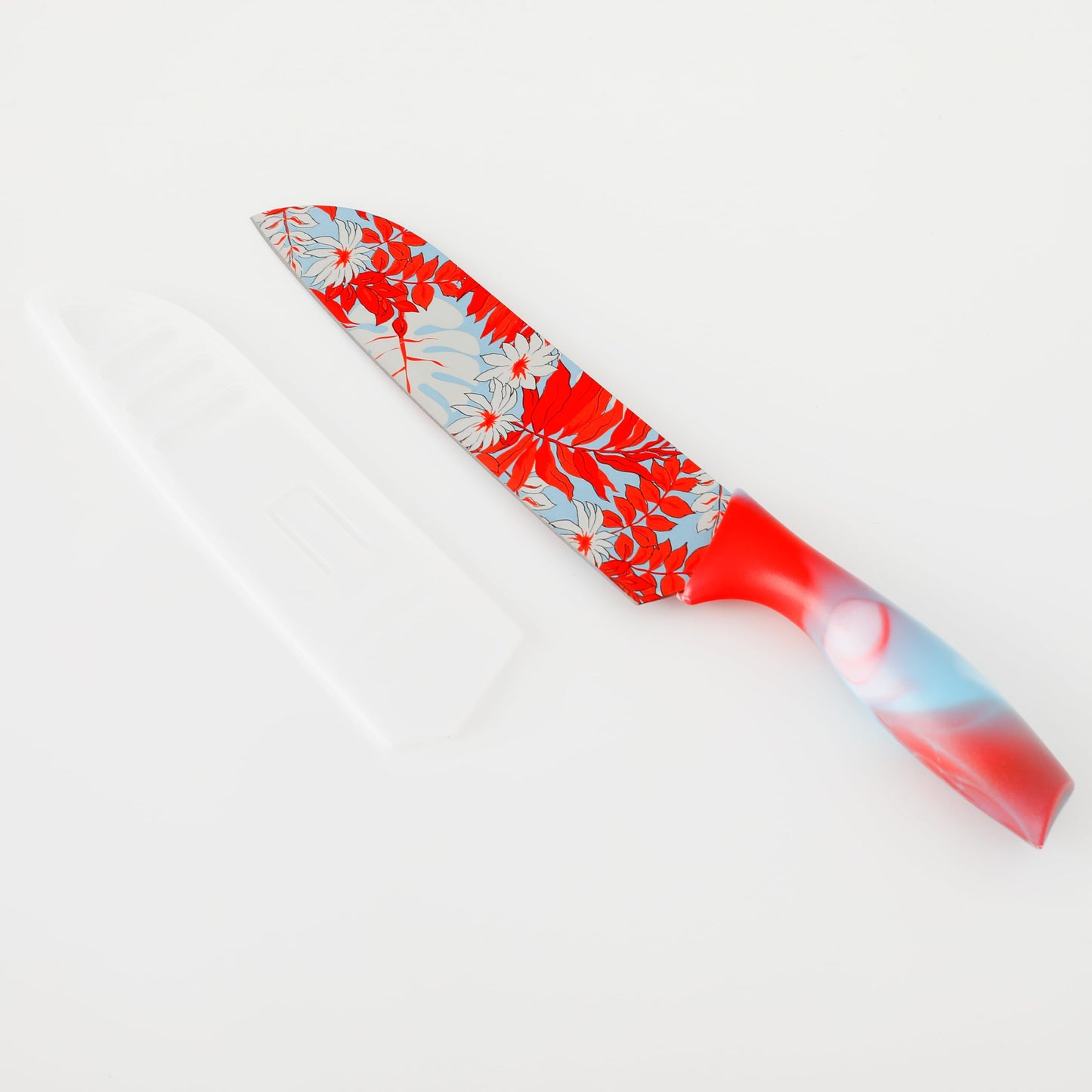 Knife Kitchen Knife Chef Knife Color Printing Santoku Knife & Non-Slip Handle with Blade Cover,7 inch, Stainless Steel|Utility Knife. (Red Set of 1)