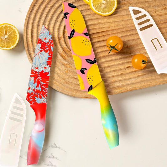 Introducing the Better Home Knife, a versatile kitchen companion designed for both professional chefs and home cooks. This 7-inch Santoku Knife combines functionality with modern aesthetics, featuring a striking color-printed design alongside a robust stainless steel blade.