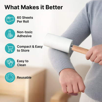Lint Roller for Clothes (1Pcs + 2 Rolls, 60 Sheets/Roll)| Lint Remover for Clothes With Wooden Handle, Easy Tear Sheets| Clothes Roller Cleaner | Fabric Shaver For Lint, Pet Hair, Dust